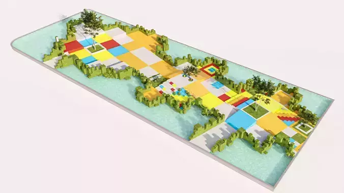 This is a premium, high-concept 3D model of an Artistic Children’s Play Area situated on a water body. Designed for cutting-edge landscape architectural visualizations (Arch-Viz), this model blends functional play equipment with fluid, organic forms that interact with an aquatic environment.