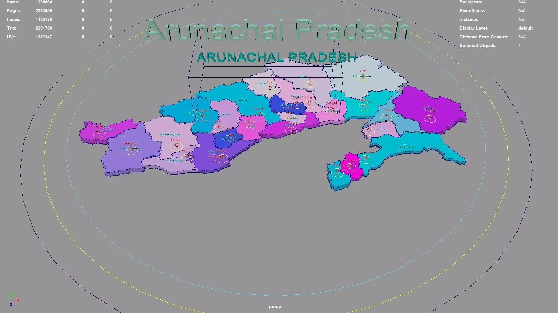Arunachal Pradesh regions : The model is divided according to the administrative region of Arunachal Pradesh. Each region is clearly separated so you can easily isolate it or change the colors. Names are also editable and separate.
