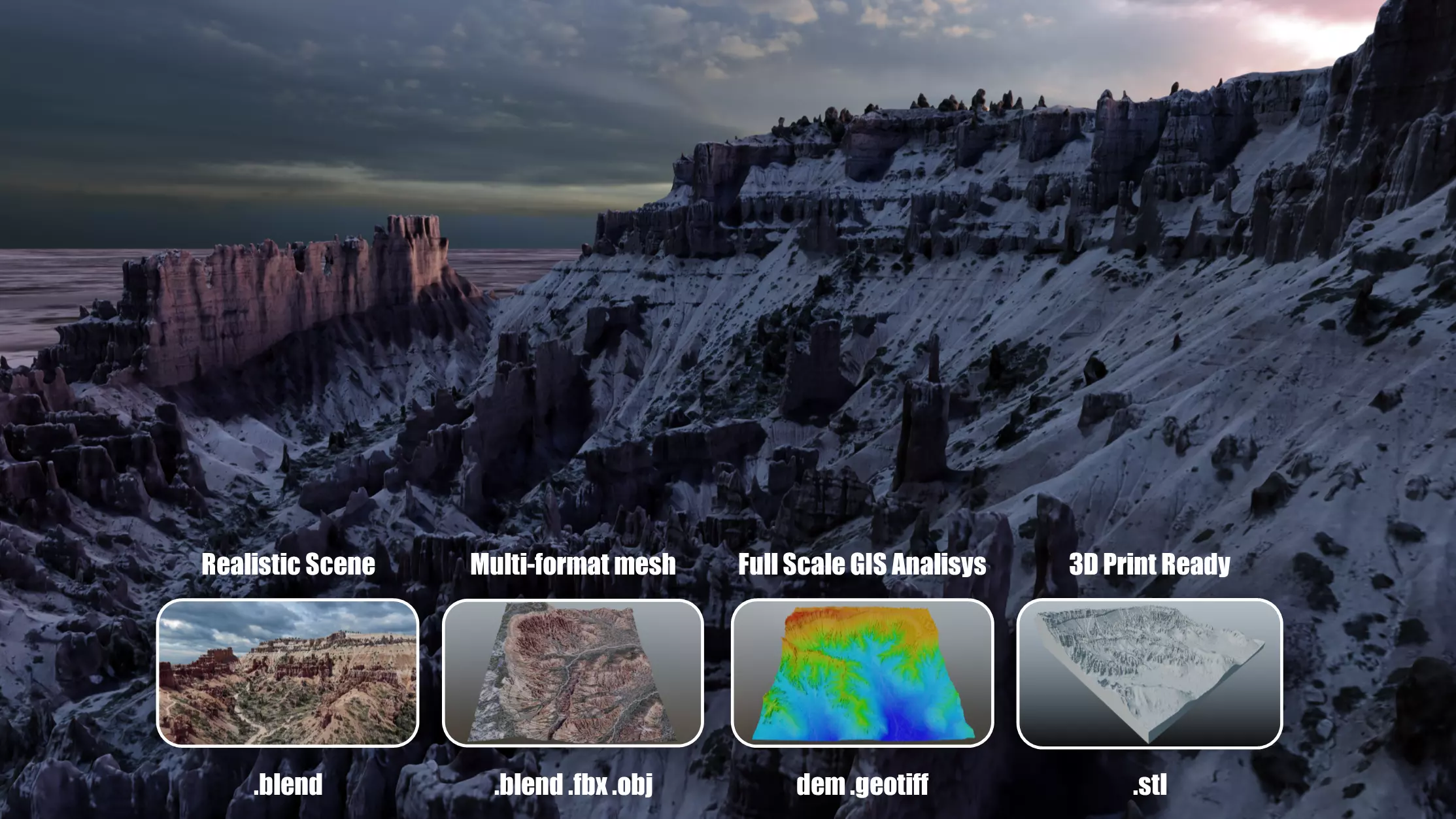 PLEASE READ DESCRIPTION CAREFULLY AND CHECK ALL THUMBNAILS FOR PACKAGE CONTENT PREVIEW BEFORE BUY.Developed from imagery at full scale with controlled precision to ensure correct proportions this model depicts an area of 287ha/709ac with elevations ranging from 2218 meters to 2568 meters. Probably one of the most natural complex reliefs, Bryce Canyon rock structures are as incredibly inspiring as challenging to replicate. Package includes the realistic scene (.blend), raw model with base texture format (.obj, .mtl, .png), interchangeable format (.fbx), digital terrain model format (.geotiff) and a 3D remeshed model ready for 3D printing/CNC machining (.stl).Realistic scene (.blend) is very versatile and all environment variations shown in thumbnails can be easily configured just by permuting between several hdris (included), minor adjustments on shader parameters and light sources (secluded scene shown on model cover is configured by default).Interchangeable format (.fbx) has embedded base texture.A XYZ coordinated format is included (.geotiff DEM) and can be used to generate contours and perform a wide range of geospatial analysis.Finally a slightly trimmed and remeshed model (.stl) can be used to generate a scaled mockup of the terrain, by 3D printing or CNC machining (I’m planning to publish a tiled version of this model soon, this will allow large scale mockup on small format printers).