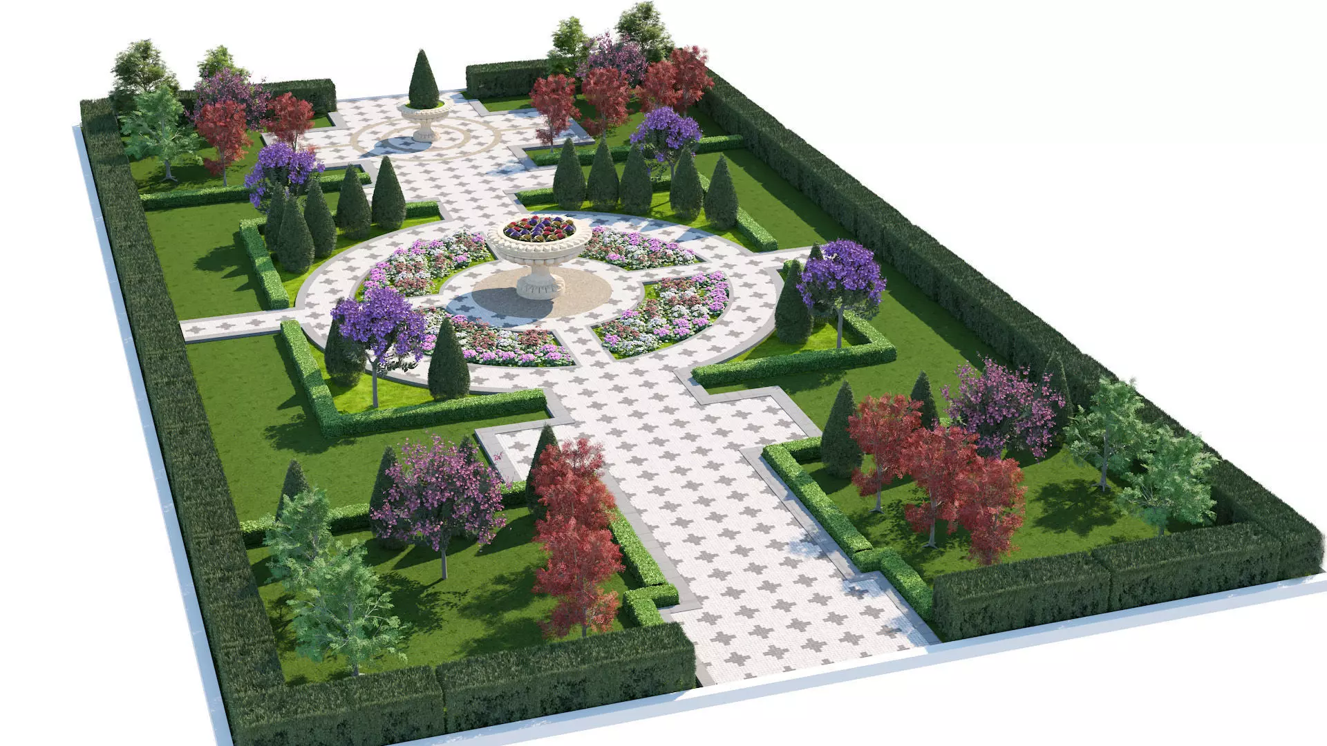 Key FeaturesIntricate Landscape Design: Features a symmetrical French Formal layout with manicured boxwood hedges, geometric grassy areas, and clean border lines.