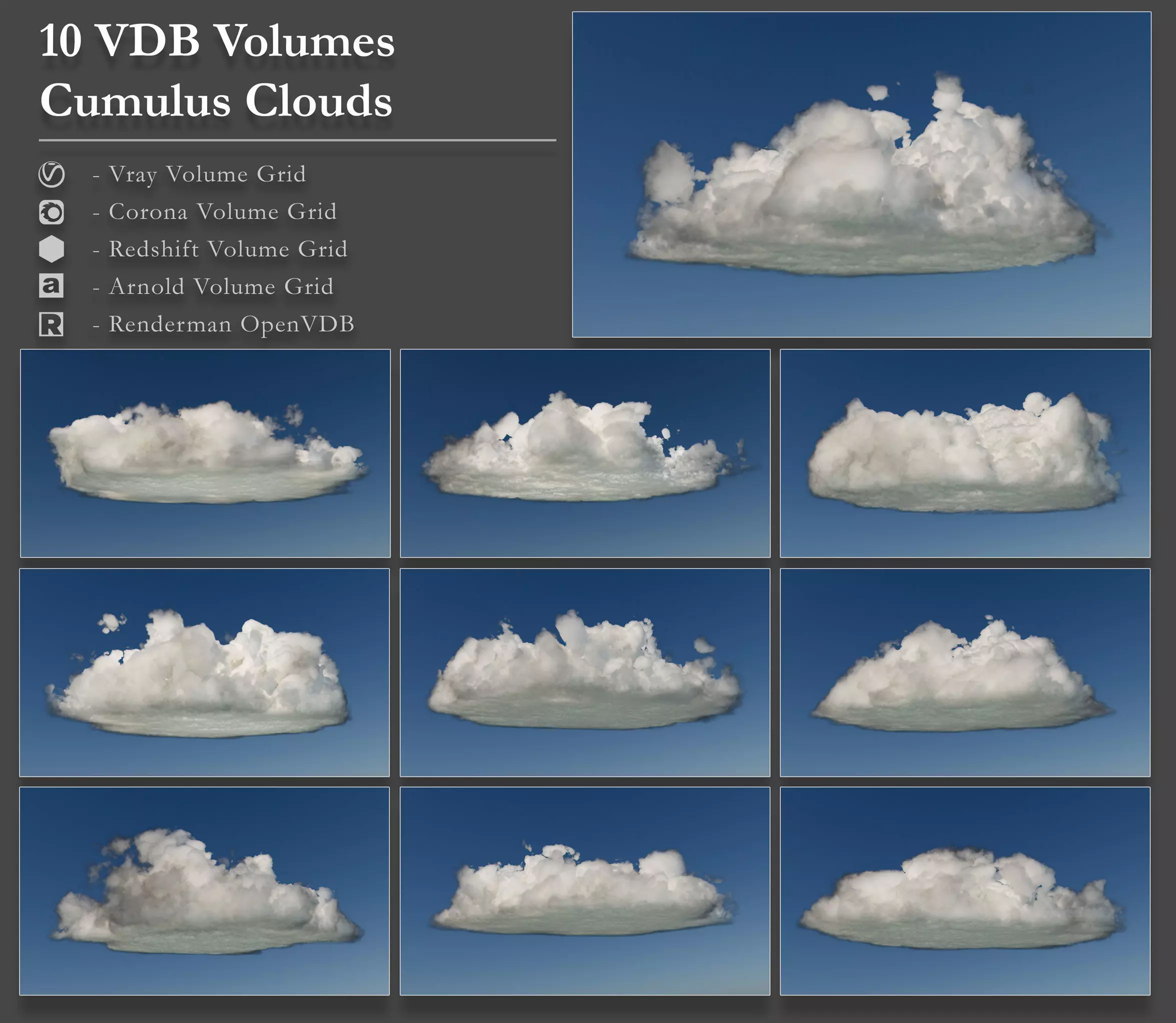 Beautiful low altitude cumulus 3d clouds. This includes 10 VDB Volumetric Clouds and 10 preview renders. The preview renders were made using Arnold but these clouds will work in any renderer which supports OpenVDB Volumetric Grids like Vray, Arnold, Corona, Renderman, Redshift, Octane, and Cinema4d Standard Renderer. No need to use other plugin's to simulate the clouds as they are already pre-made and ready to import. I also include an example Arnold Shader screenshot. Average Voxel Density Ranges are 0 - 4.6