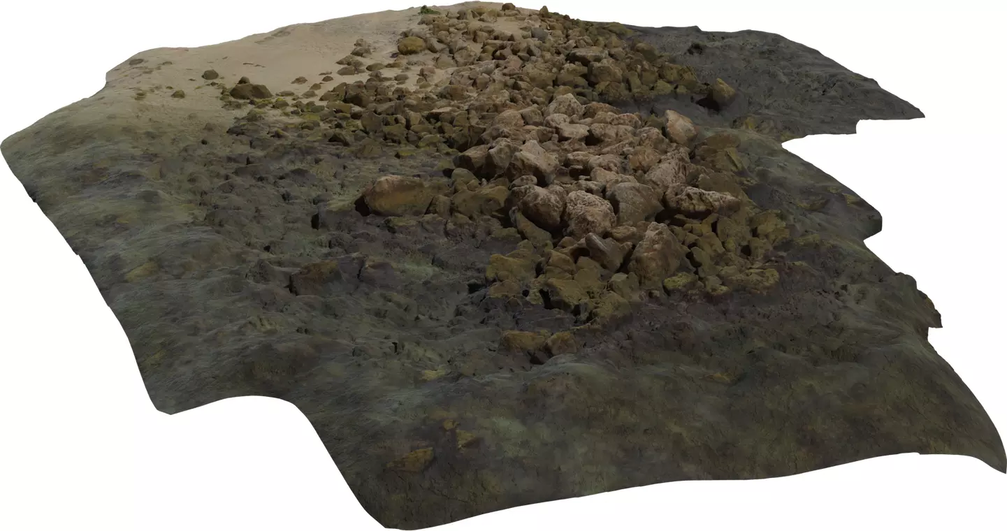 This asset is a detailed 3D scan of a coastal shoreline patch where scattered rocks transition into wet, algae‑stained ground and sand. The surface flows from a central ridge of stones into softer, eroded surroundings, making it ideal for tidal zones, river mouths, or damp cave entrances. PBR textures capture the subtle color shift from dry beige sand to dark green‑brown algae and wet rock, with basecolor, roughness, normal, and AO maps ready for modern engines. The mesh uses clean triangulated topology to preserve small stones and organic undulations while staying efficient enough for real‑time use when tiled or used as a hero foreground piece. UVs are fully unwrapped for lightmapping and shader blending inside major DCC tools and game engines. This coastal rock‑and‑algae patch is perfect for games, cinematics, and visualization scenes that need plug‑and‑play shoreline detail with minimal setup.