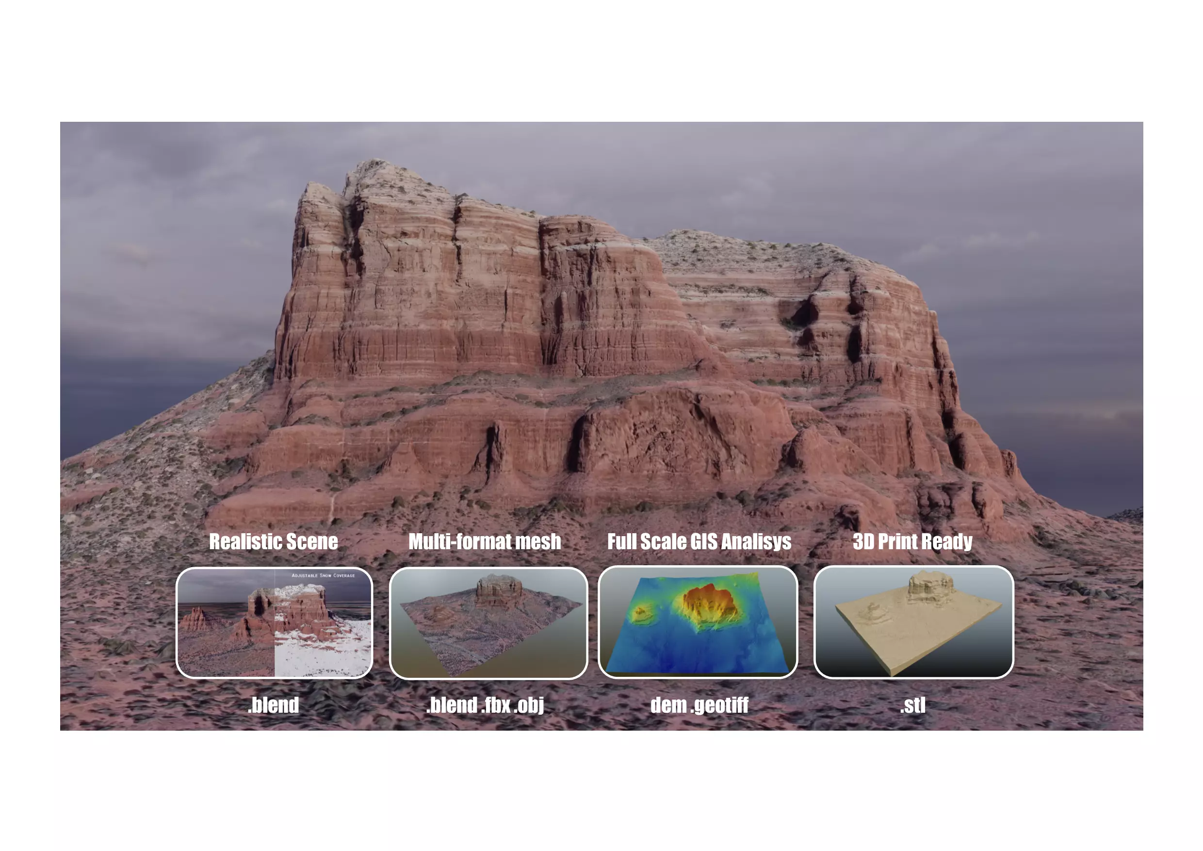 Please read carefully the description and check all thumbnails. If some doubts remains contact me and I’ll be glad to answer your questions about the model. Developed from imagery, the model is at full scale and it was generated with controlled precision to ensure right proportions. Cell size is approximately 1 meter for an area of 304ha/751ac with elevations ranging between 1261 to 1673 meters. The scene can be set to snowy just by changing node output (properly grouped and labeled nodes in shader editor,blender scene).The packages includes several formats that can be used in different scopes..blend file realistic scene with terrain mesh, base texture, environment sky, ground plane (basic texture to extend surroundings and showcase) and some light sources..obj .mtl .png files, these are the raw elements used to compose blender scene, includes terrain and base texture.fbx file, similar to previous files, all in one, terrain and base texture.geotiff file, includes de digital elevation model matrix, full scale, XYZ coordinates, able to perform geospatial analysis or build a triangulated analytical surface with contours..stl file, this file is a remeshed solid version of the raw model, slightly trimmed, regular quad grid, watertight closed and thus ready for 3D printing.