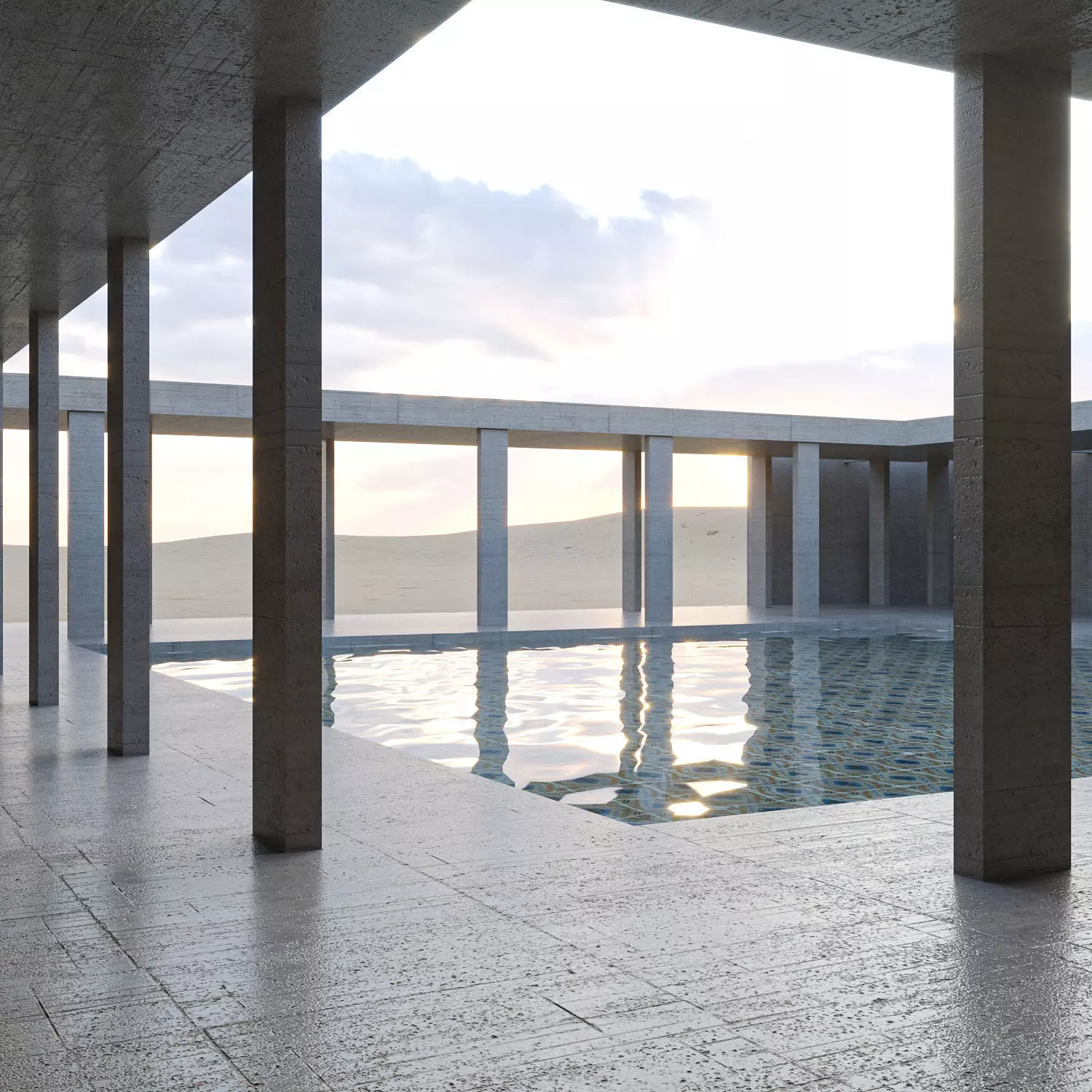 Square concrete architecture with pool in desert.Scene modeled 3ds max 2021 and rendered corona 5.0Outer line dimensions: length: 3360 cm, width: 3360 cm, height: 478 cmPool dimension: 1760 cm x 1760 cm