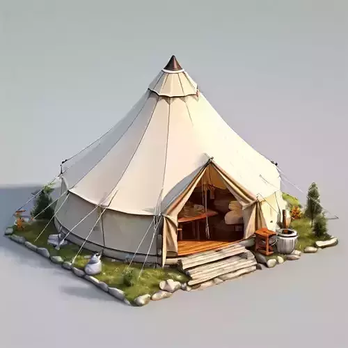 This highly detailed 3D model of a canvas camping tent offers a realistic and immersive experience, perfect for various applications. Ideal for game development, architectural visualization, virtual reality (VR) experiences, and even digital art projects. The model includes interior details like a table, seating, and bedding, adding to its versatility. Available in multiple formats (GLB, OBJ, FBX, STL) for seamless integration into different workflows. Optimized for both real-time applications and high-quality static renders. Key features include: detailed interior, PBR textures, clean topology, UV unwrapped, and realistic materials. Whether you're creating a captivating campsite scene, developing an interactive game environment, or designing a virtual tour, this model offers the quality and flexibility you need. The tent's ropes, canvas texture, and wooden elements contribute to its authentic appearance. The surrounding vegetation and accessories, such as a fire pit, enhance the scene's overall realism, making it suitable for close-up shots and detailed visualizations.