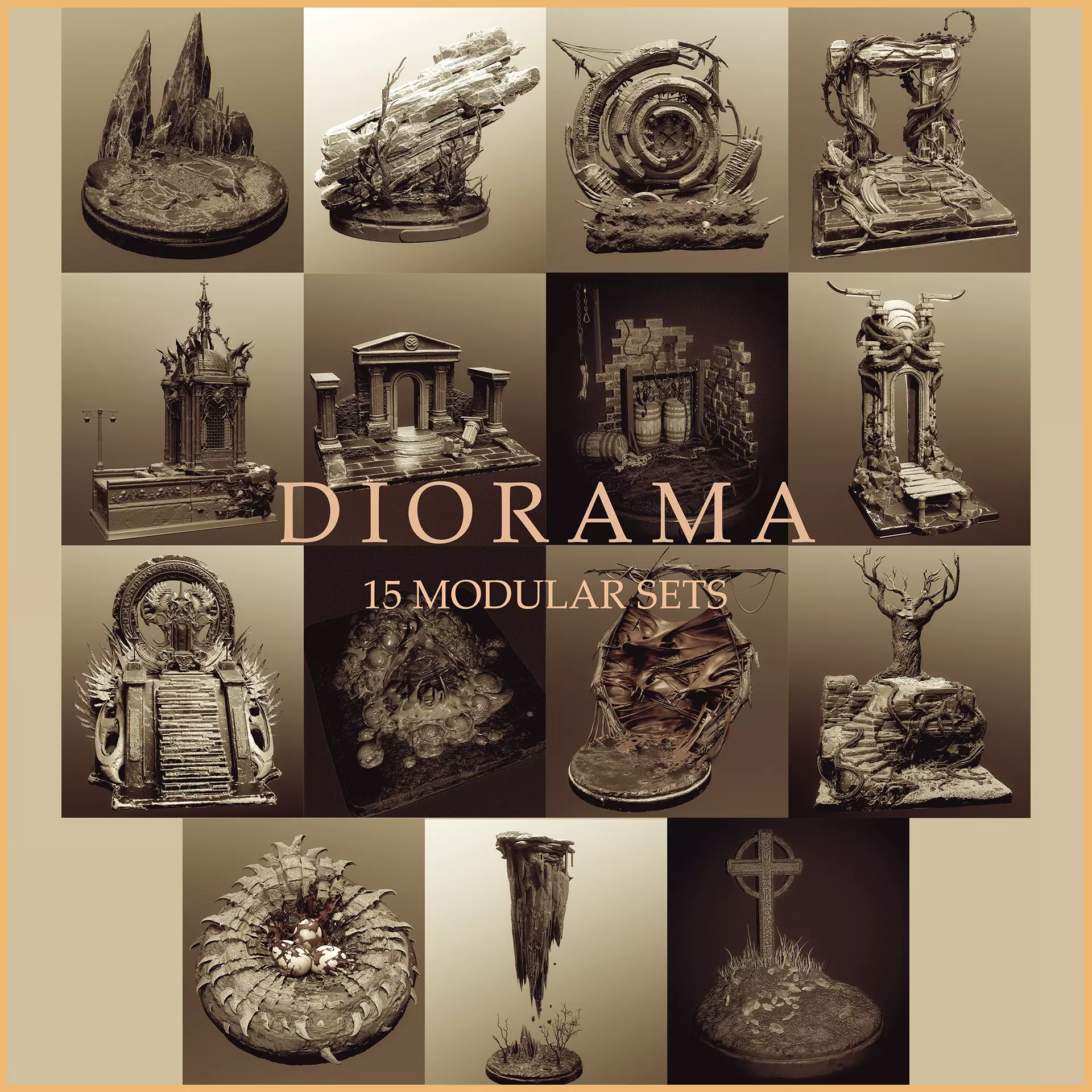 Quickly add on to or create dioramas and bases with these 15 modular sets. I often find myself needing a quick base to pose my characters and creatures on, so I went overboard and made this pack. From small intimate settings to grander sets fit for dragons, everyone will benefit from having these in their toolkit. On top of that, an insert mesh of nearly 100 spare parts is included for quick access to further modify these sets or start from scratch.