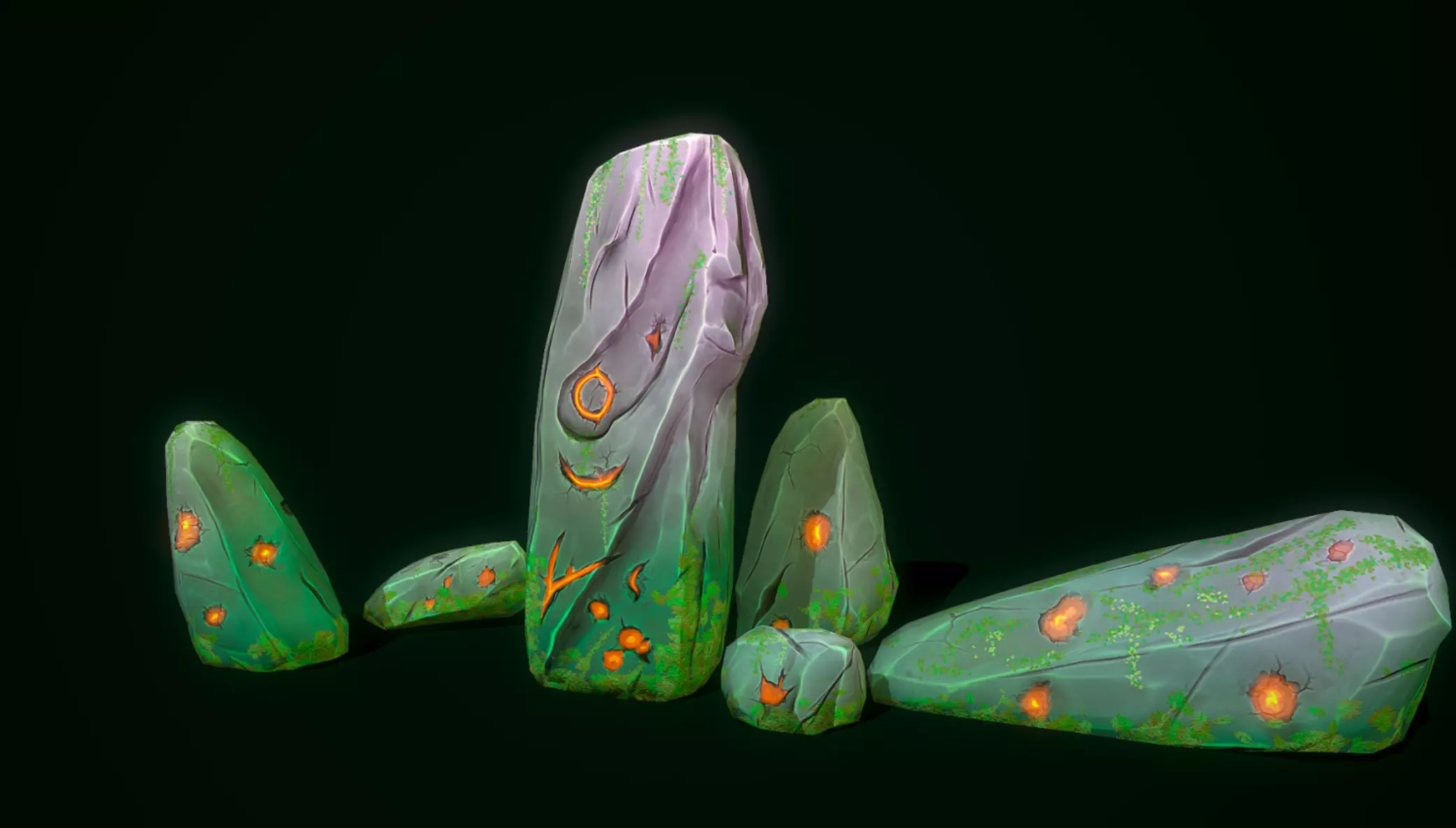 Key Features:Stylized Hand-Painted Textures: Rich details with magical carvings and glowing runes.Emissive Effects: Glowing cracks and symbols that react beautifully to lighting.Low-Poly & High-Poly Models: Optimized for both real-time applications and cinematic quality renders.PBR Ready: Includes Roughness, Normal, Metallic, Emissive, Ambient Occlusion (AO), and Albedo maps for realistic material behavior.Modular Design: Easily combine or scatter stones to create dynamic environments.Game-Ready: Clean UVs, optimized topology, and compatible with Unreal Engine, Unity, and other 3D platforms.
