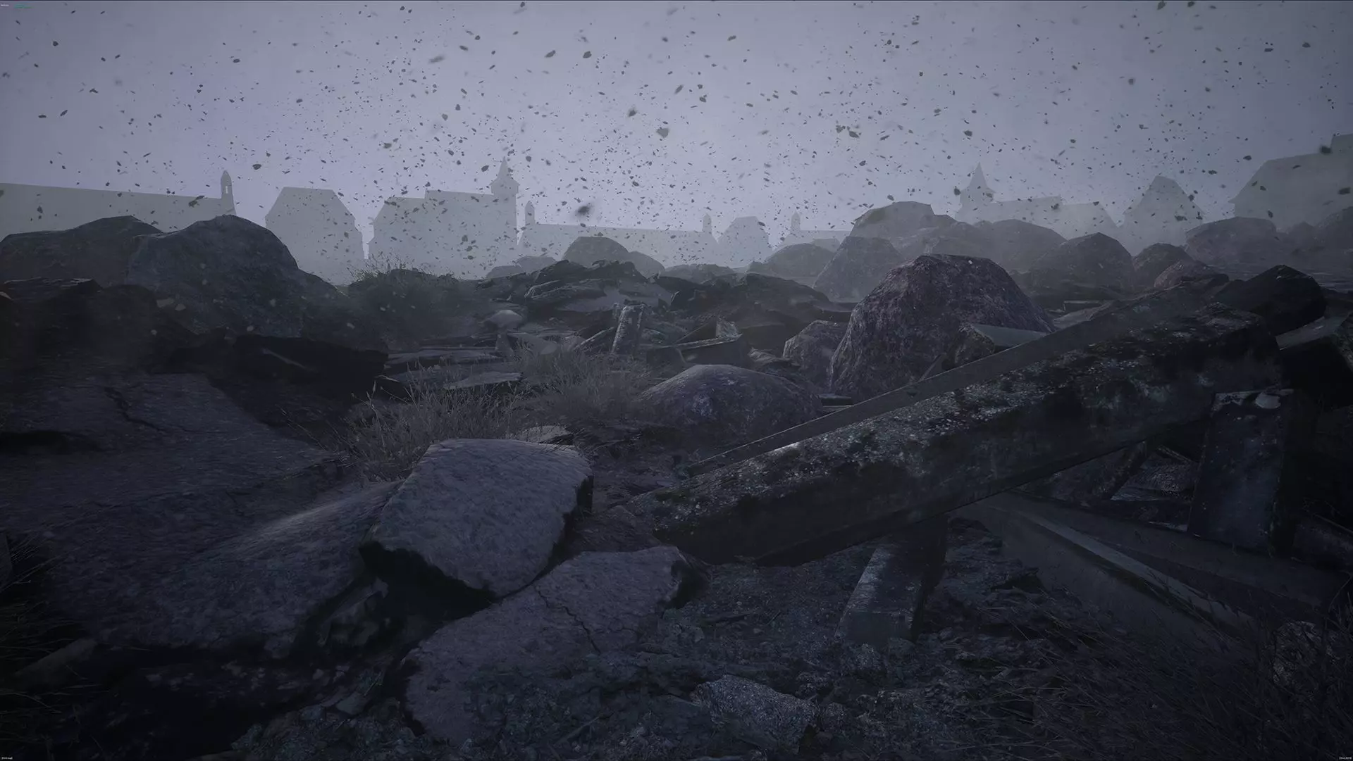 Everythings destroyed and only stormy winds push the dry sand around - type of environment. High and lowpoly meshes with lods to populate the scene, storm-particle fx for atmosphere.