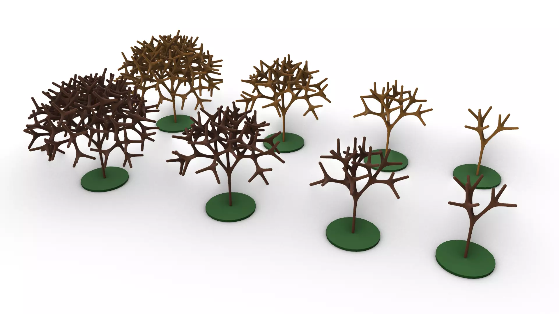 A collection of trees smooth mesh forms, they have a unique fractal branching design, four unique tree designs in both High-Poly and Low-Poly mesh densities, the form structure could be easily melted with nature elements in any design, the model was created using computational parametric tools to achieve the most accurate geometry with clean details, it could be used for architectural render purposes outdoors, and also for Landscaping and urban landmarks.