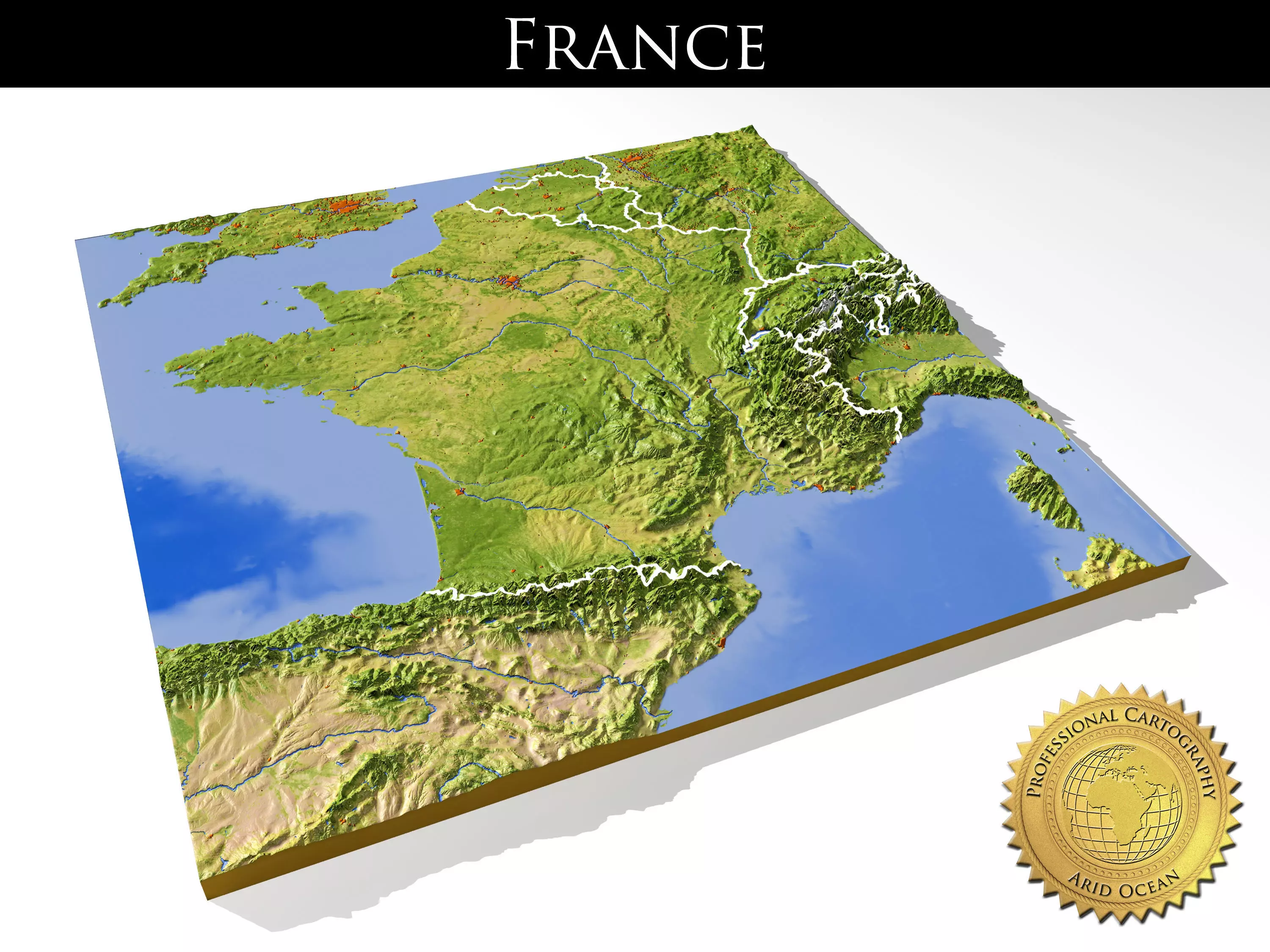 The set contains three models: a relief map of France with surrounding area, a separate relief cutout of the state area, and a separate plain cutoutof the state outline.