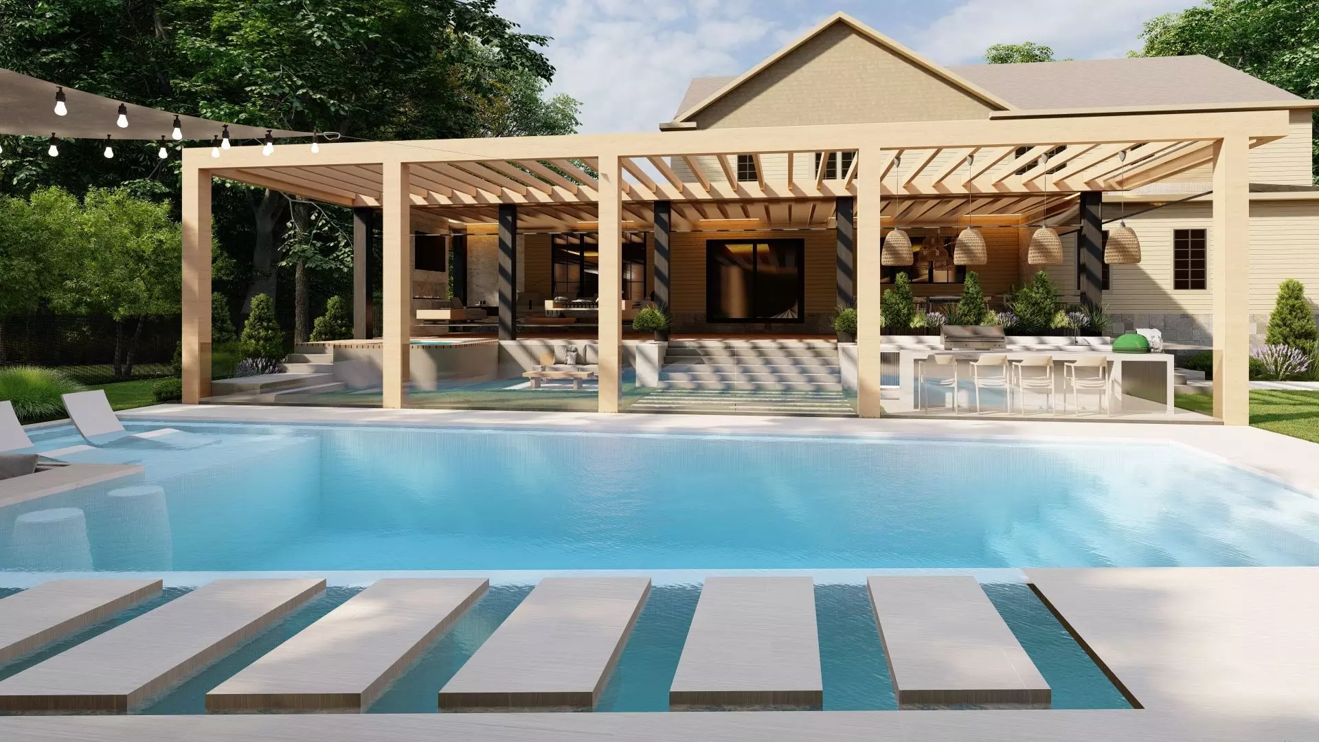 This is a high-quality 3D visualization of a modern private backyard with a luxury swimming pool, pergola lounge, and outdoor dining area. The design features a seamless connection between indoor and outdoor living spaces, highlighted by warm wooden textures, comfortable furniture, and natural greenery.