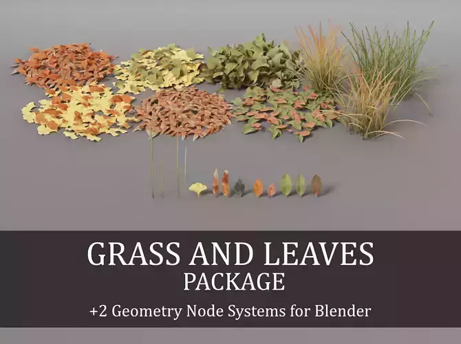 Grass and leaves package + 2 Geometry nodes for Blender contains: