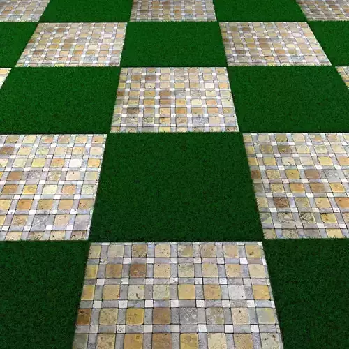 This high-angle digital render features a striking checkerboard pattern designed for an outdoor landscape. The layout alternates between square patches of lush, deep-green grass and mosaic-style stone pavers.