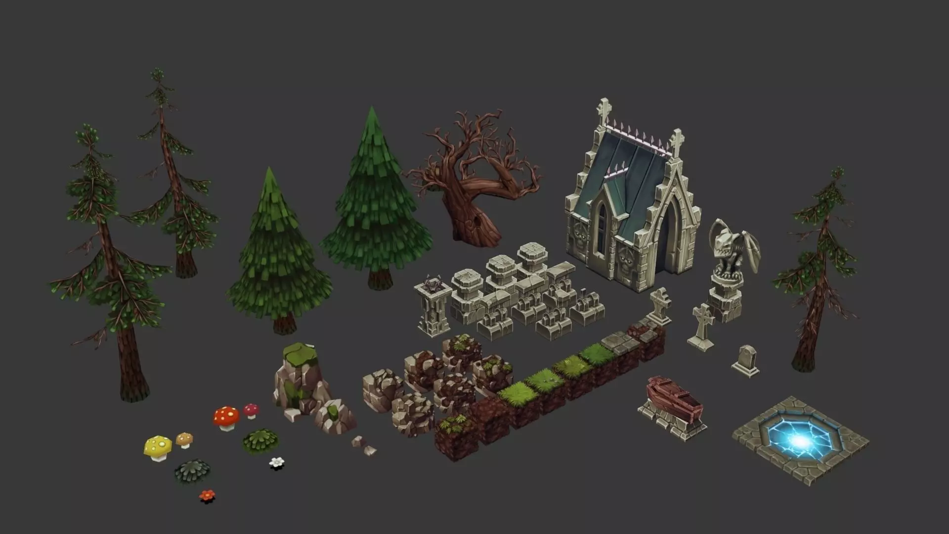 a small pack of 49 models from wich you can create a graveyard or any kind of blocky forest map for your isometric game. why isometric? because some models have only one visible side, for blocks have only 3 sides instead of 6.