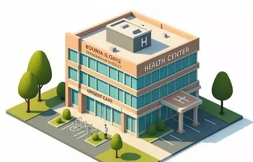An inviting 3D model of a Health Center building rendered in a charming isometric, cartoonish style. The multi-story structure features a light peach-colored exterior with large blue-tinted windows and clear signage for HEALTH CENTER, URGENT CARE, and a fictional location BOUNIA ILOAKS, CHANDRAYAJUNI DISTRICT. The building includes a covered entrance with a white H logo on the ground, possibly indicating a helipad or hospital affiliation, and a rooftop structure also marked with an H. The surrounding environment features stylized green trees, a paved parking lot with a handicap space, and a small figure of a person, suggesting scale. This model is ideal for casual games, educational content, urban planning visualizations, or any project requiring a friendly and recognizable medical facility asset.