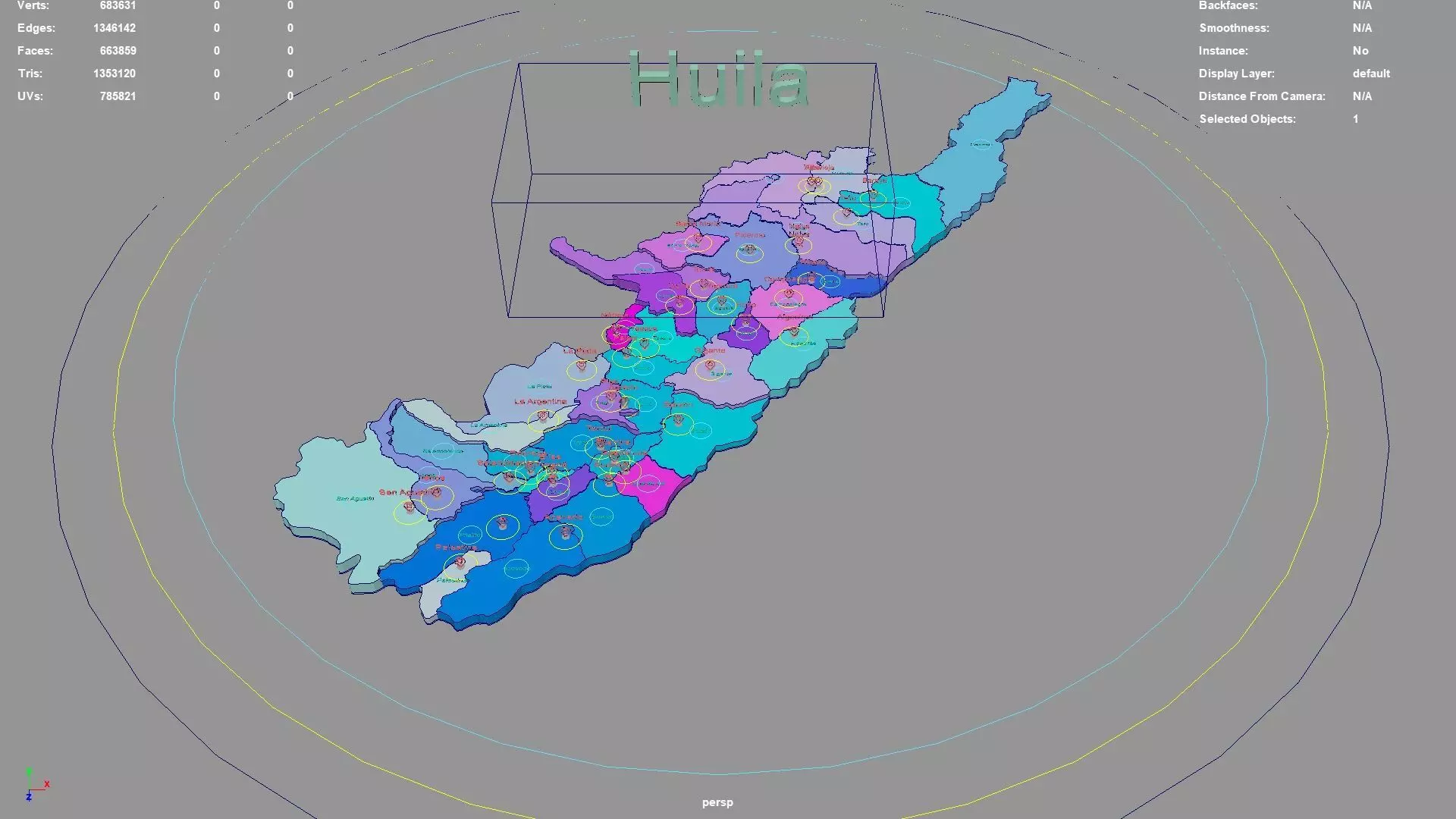 Huila regions : The model is divided according to the administrative region of Huila. Each region is clearly separated so you can easily isolate it or change the colors. Names are also editable and separate.