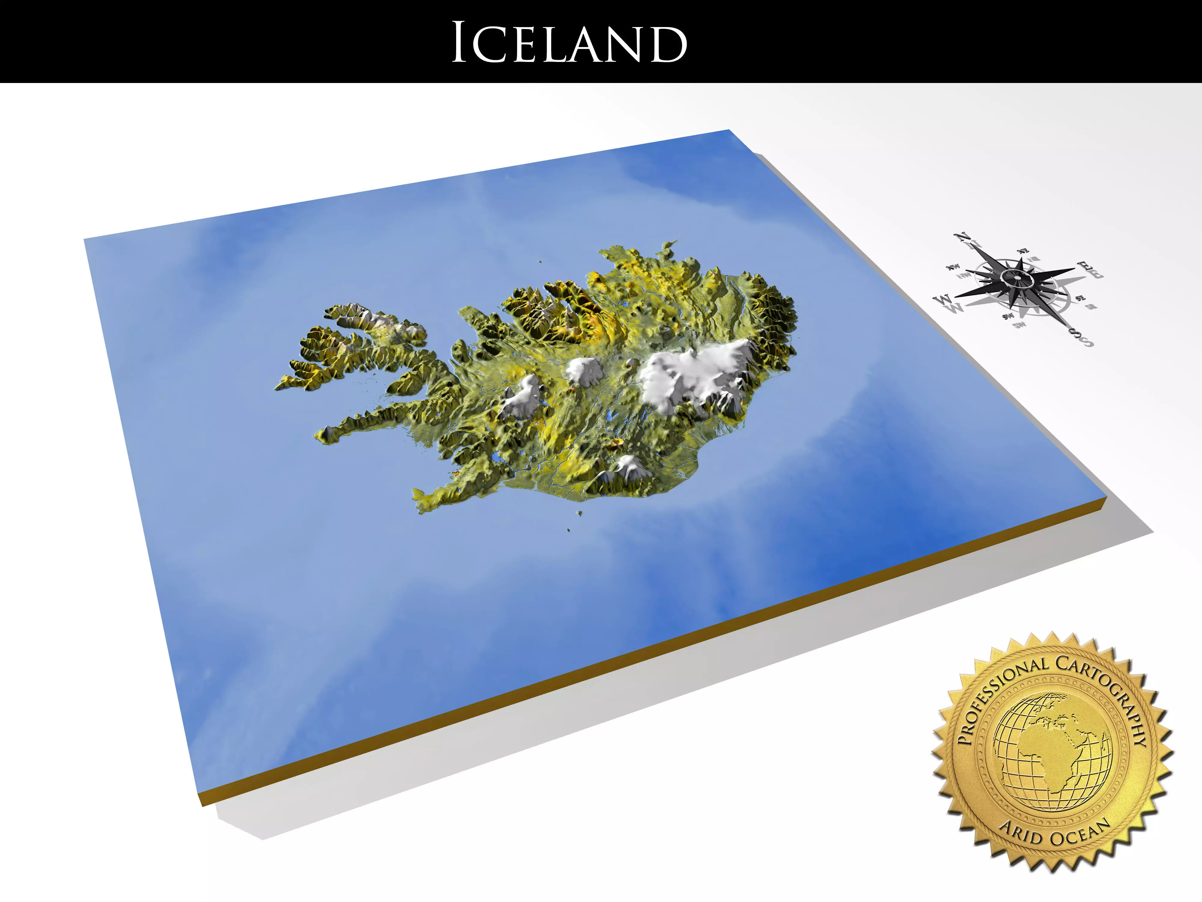 The set contains three models: a 3D relief map of Iceland with surrounding area, a separate 3D relief cutout of the state area, and a separate plain cutoutof the state outline.