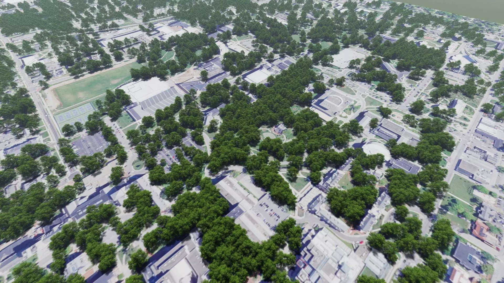 Medium resolution 3d model of Indiana University campus. The model was created using Sketchup and exported to Lumion with trees added.
