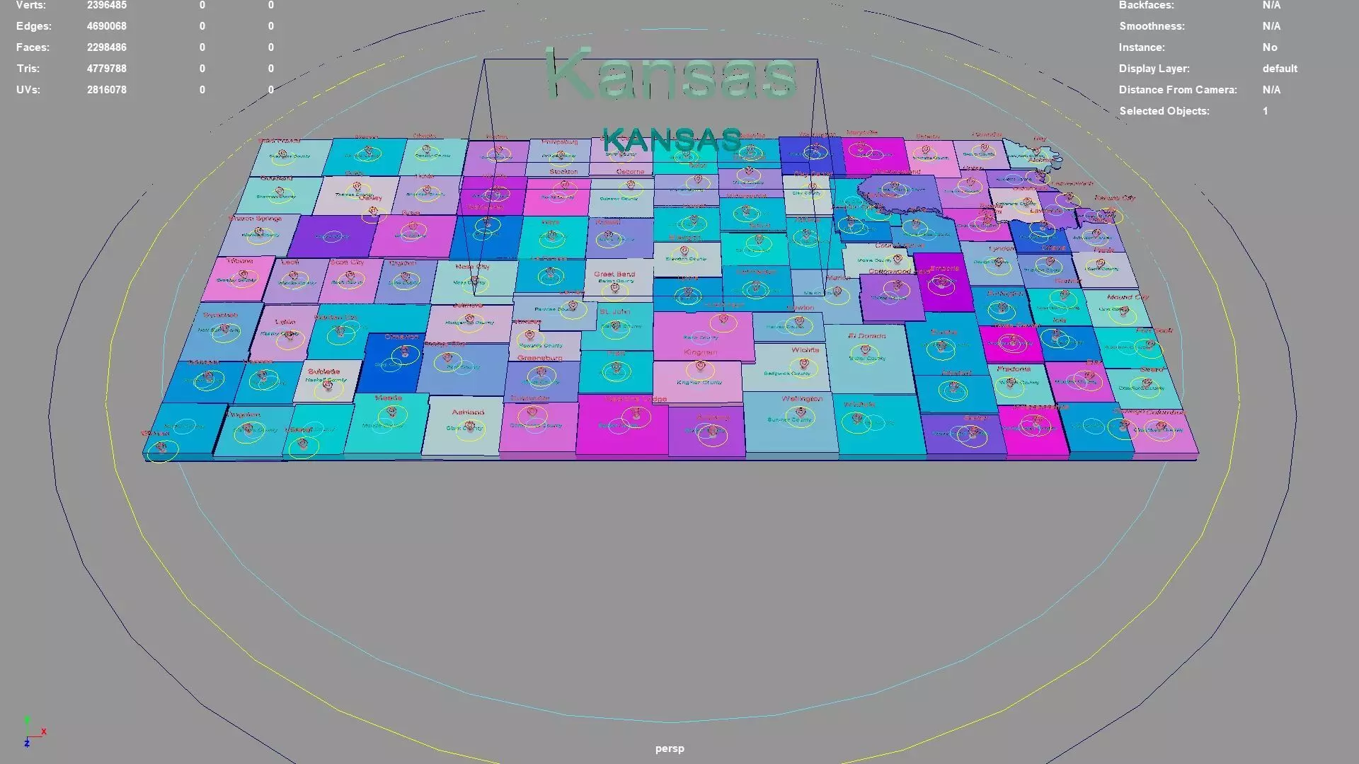 Kansas regions : The model is divided according to the administrative region of Kansas. Each region is clearly separated so you can easily isolate it or change the colors. Names are also editable and separate.