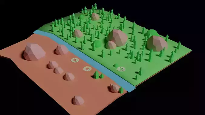 This low poly 3D world is a stylized environment featuring a natural landscape divided by a flowing river. The scene includes dense forests made of simple conifer trees, scattered rocks and boulders, grassy terrain, and a contrasting barren land area. The world is designed with a clean geometric aesthetic, making it ideal for games, simulations, prototypes, and stylized visualizations.