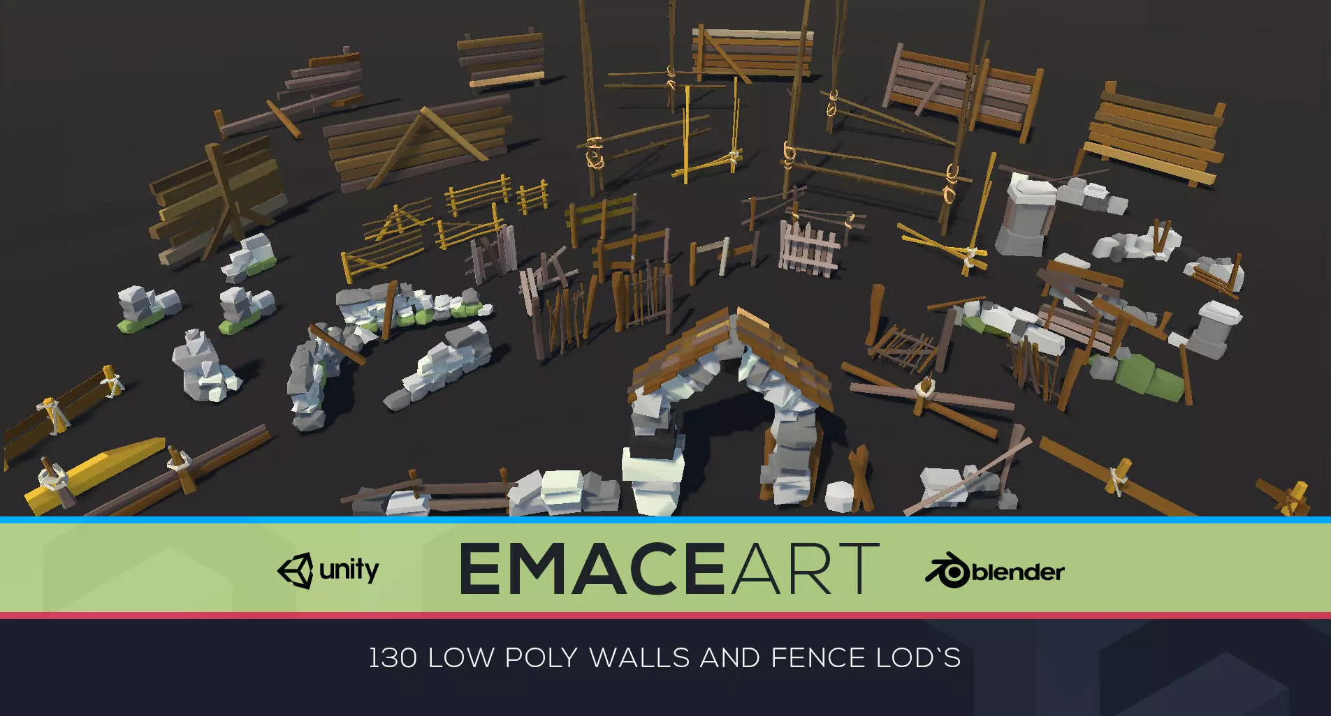 Low Poly Fences and Wall Bundle Pack 1-3 LODS Low-poly 3D model