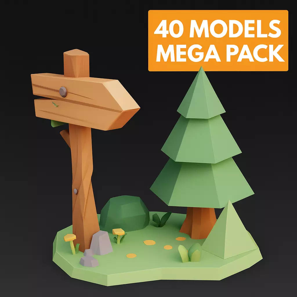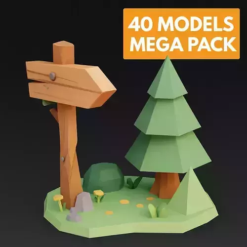 A stylized low poly forest village pack containing 40 optimized, game‑ready 3D models designed for lush woodland environments, cozy cabins, and adventure‑style forest settlements.