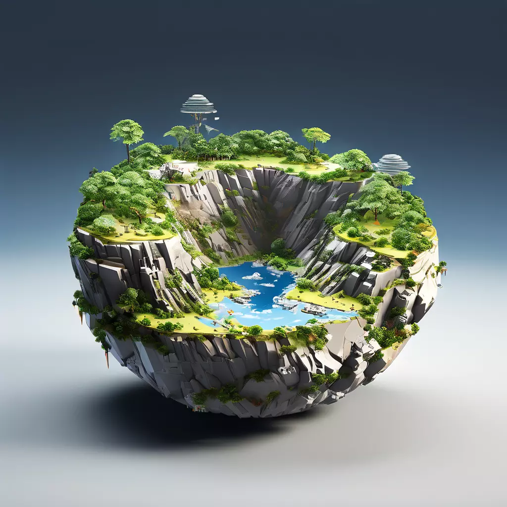 This low-poly 3D model represents a unique spherical island featuring a central lake, lush vegetation, rocky cliffs, and futuristic structures. Ideal for game development, especially stylized or mobile games, architectural visualization, AR/VR experiences, and digital art projects. Available in multiple formats, including GLB, OBJ, FBX, and STL, ensuring compatibility with various software. Optimized for real-time applications with a low-poly count, yet retaining appealing visual detail. Key features include clean topology, UV unwrapped meshes, and PBR textures, ready for integration into your projects. The model is also suitable for 3D printing, allowing for physical realization of this imaginative landscape. Whether you're crafting a virtual world or a tangible object, this spherical island model offers a distinctive and versatile asset. This model is ready to be imported into your preferred 3D application and utilized for your creative endeavors.