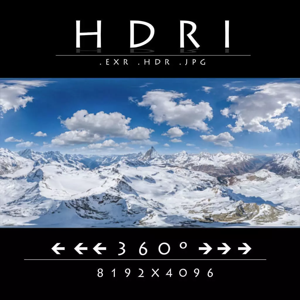 This panoramic HDRI features the iconic Matterhorn peak, surrounded by expansive snow-covered mountains, deep valleys, and dynamic alpine skies. The scene provides clean sunlight, soft natural shadows, and balanced contrast, making it ideal for high-end photorealistic outdoor environments.