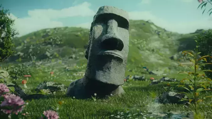 This is a detailed Moai stone statue 3D model inspired by the Easter Island sculptures. The model has realistic stone surface details with natural wear and roughness, suitable for close-up and wide shots.