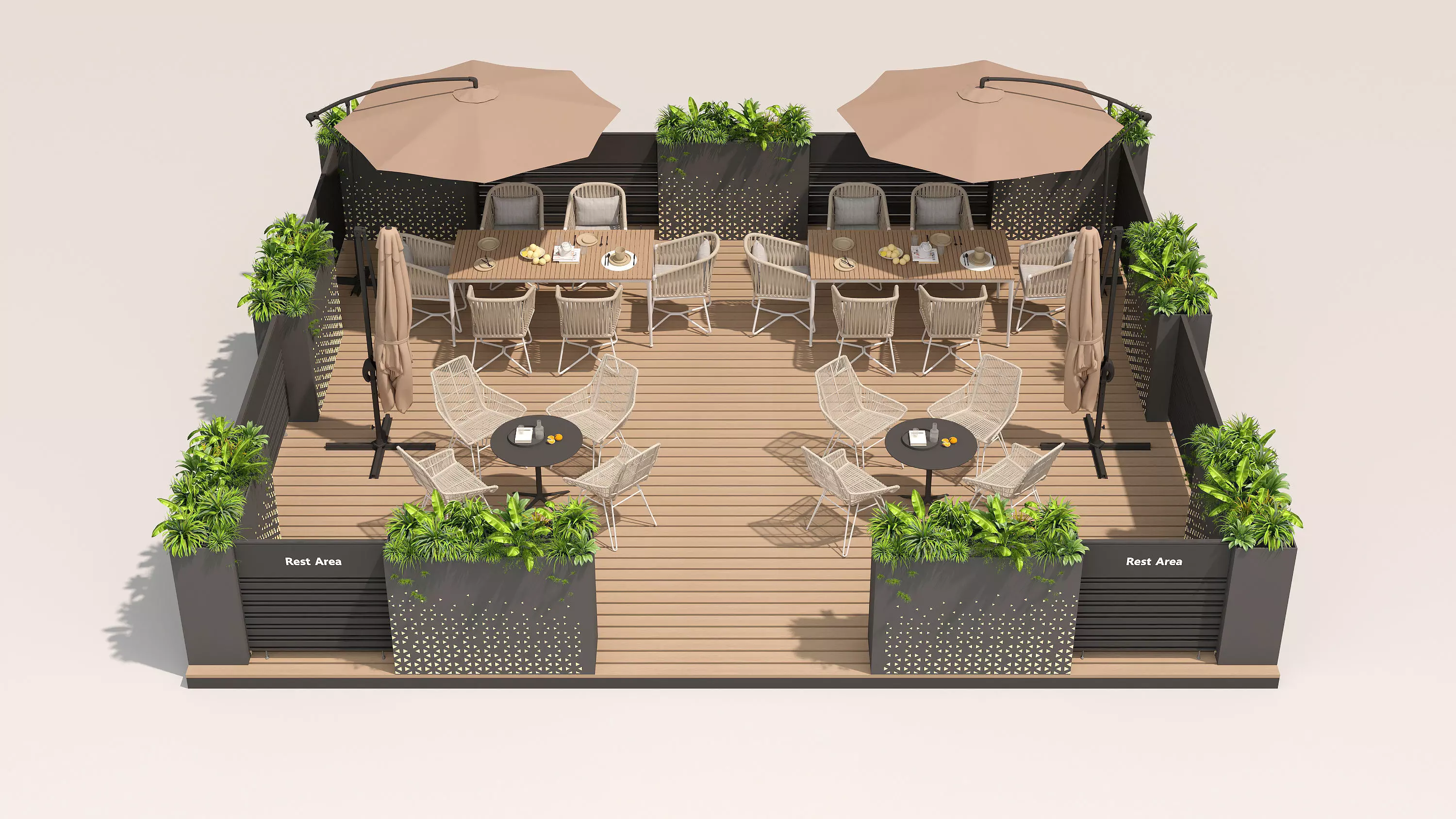 The scene features outdoor tables and chairs, sun umbrellas, wooden deck flooring, planter boxes with plants, railings, and decorative elements, making it ideal for cafes, restaurants, shopping malls, rooftop terraces, and public rest areas.
