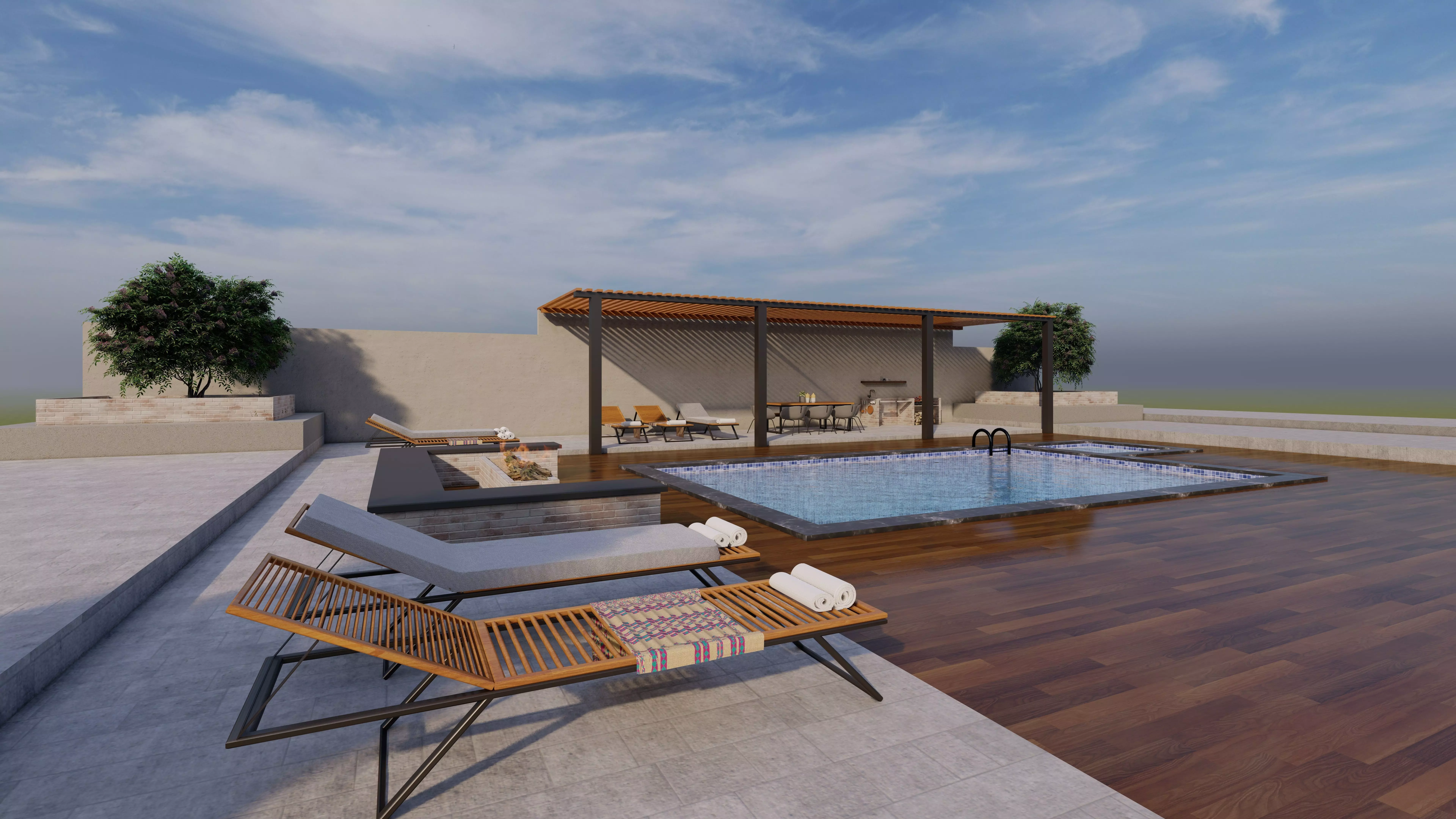 A complete modern outdoor pool scene designed for fast and high-quality Lumion rendering.Perfect for villa and residential exterior visualizations.This model is a complete modern outdoor scene including a swimming pool, jacuzzi, pergola, outdoor seating, and landscape elements, designed specifically for architectural visualization and rendering.The composition is intentionally created as a ready-to-render scene, allowing users to achieve professional results quickly without assembling separate assets.Ideal for:Modern villa exteriorsResidential yardsRoof garden visualizationsArchitectural presentationsAll elements are modeled with clean geometry and real-world scale, making the scene easy to customize while preserving its strong visual composition.Modern swimming poolJacuzzi poolPergola structureOutdoor seating & dining areaLandscape plantersPool deck and surrounding surfaces