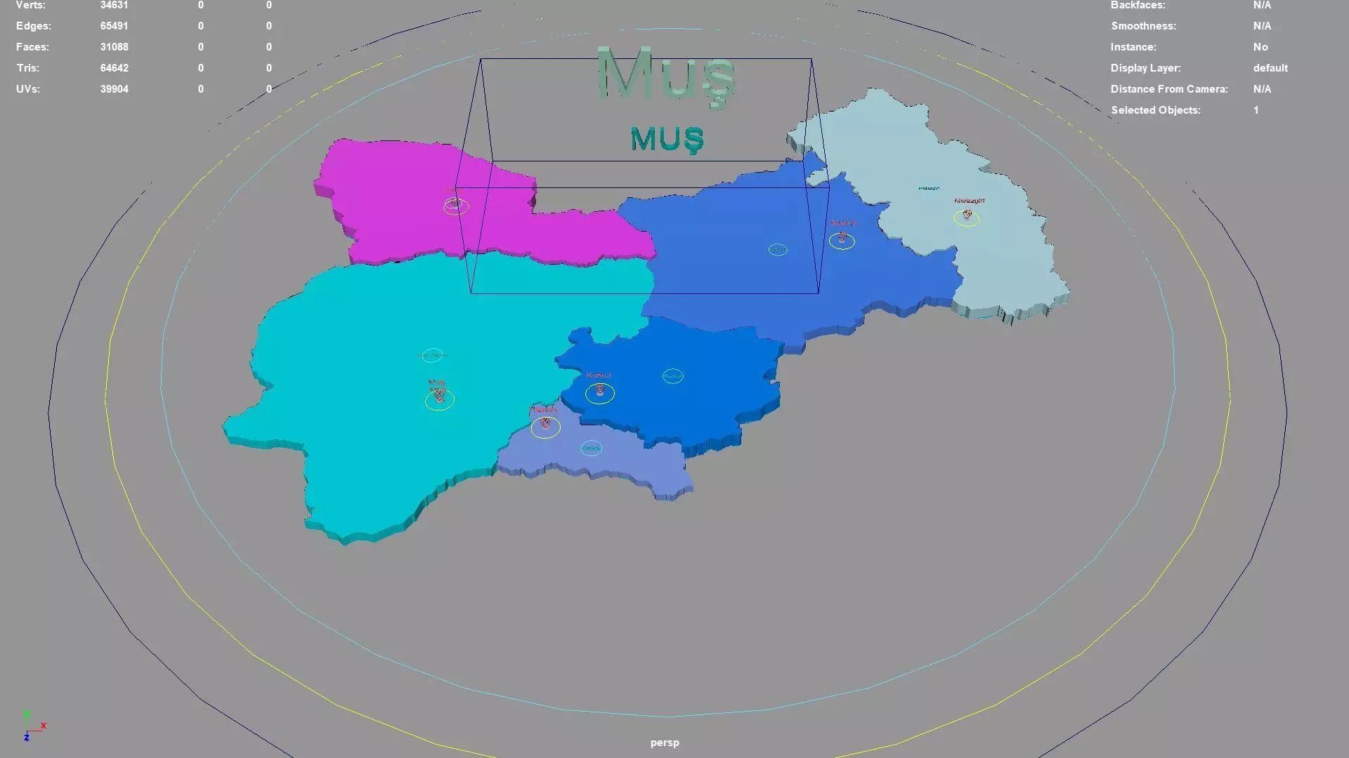 Muş regions : The model is divided according to the administrative region of Muş. Each region is clearly separated so you can easily isolate it or change the colors. Names are also editable and separate.