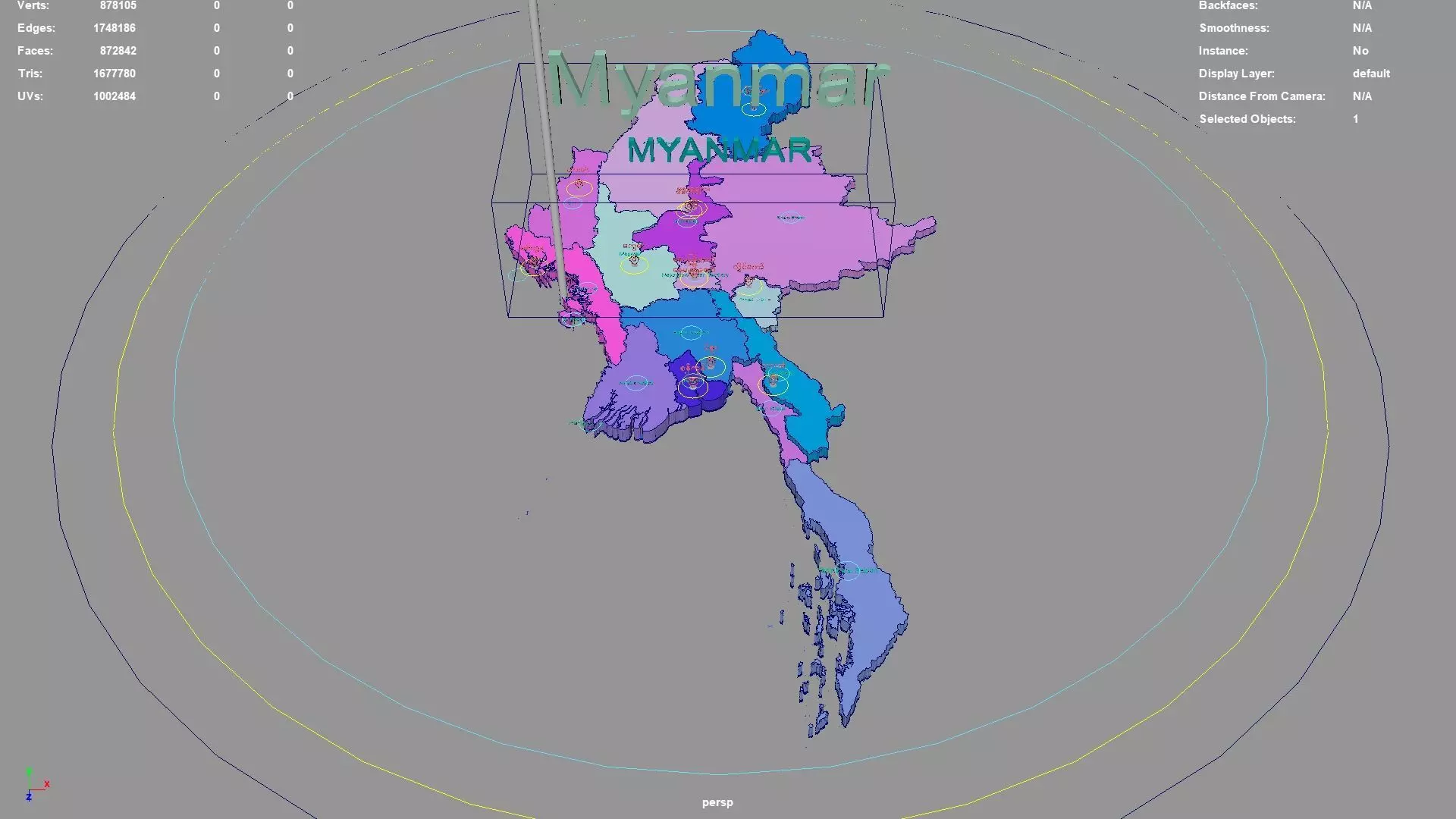 Myanmar regions : The model is divided according to the administrative region of Myanmar. Each region is clearly separated so you can easily isolate it or change the colors. Names are also editable and separate.