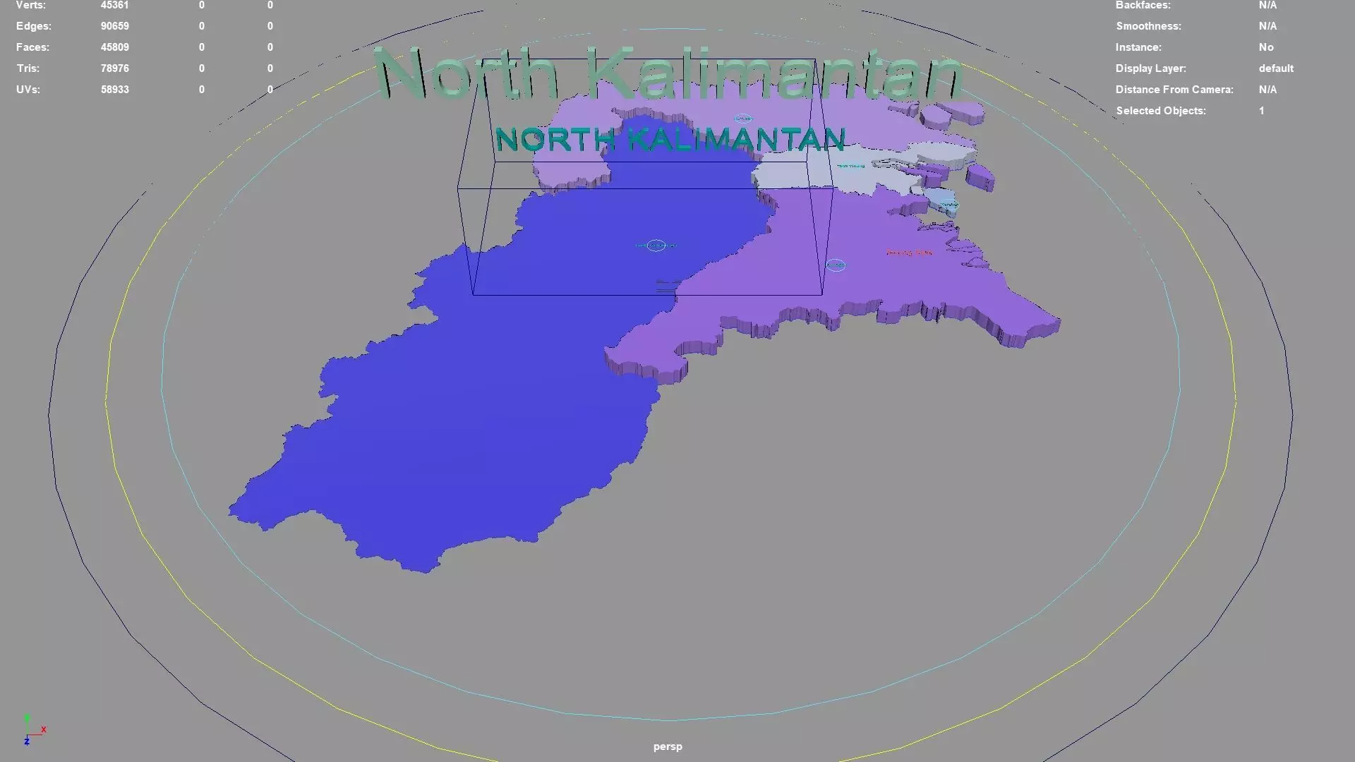 North Kalimantan regions : The model is divided according to the administrative region of North Kalimantan. Each region is clearly separated so you can easily isolate it or change the colors. Names are also editable and separate.