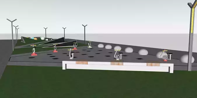 This 3D model showcases an urban park design with an interactive installation. The scene includes modern elements such as abstract colorful sculptures, interactive exercise machines, seating areas, and functional outdoor lighting. The paved pathways with dynamic urban furniture create a lively, engaging atmosphere. The model also includes a blackboard with mathematical formulas, adding an educational and playful touch to the park. It is perfect for use in city planning, architectural visualizations, or designing public spaces.