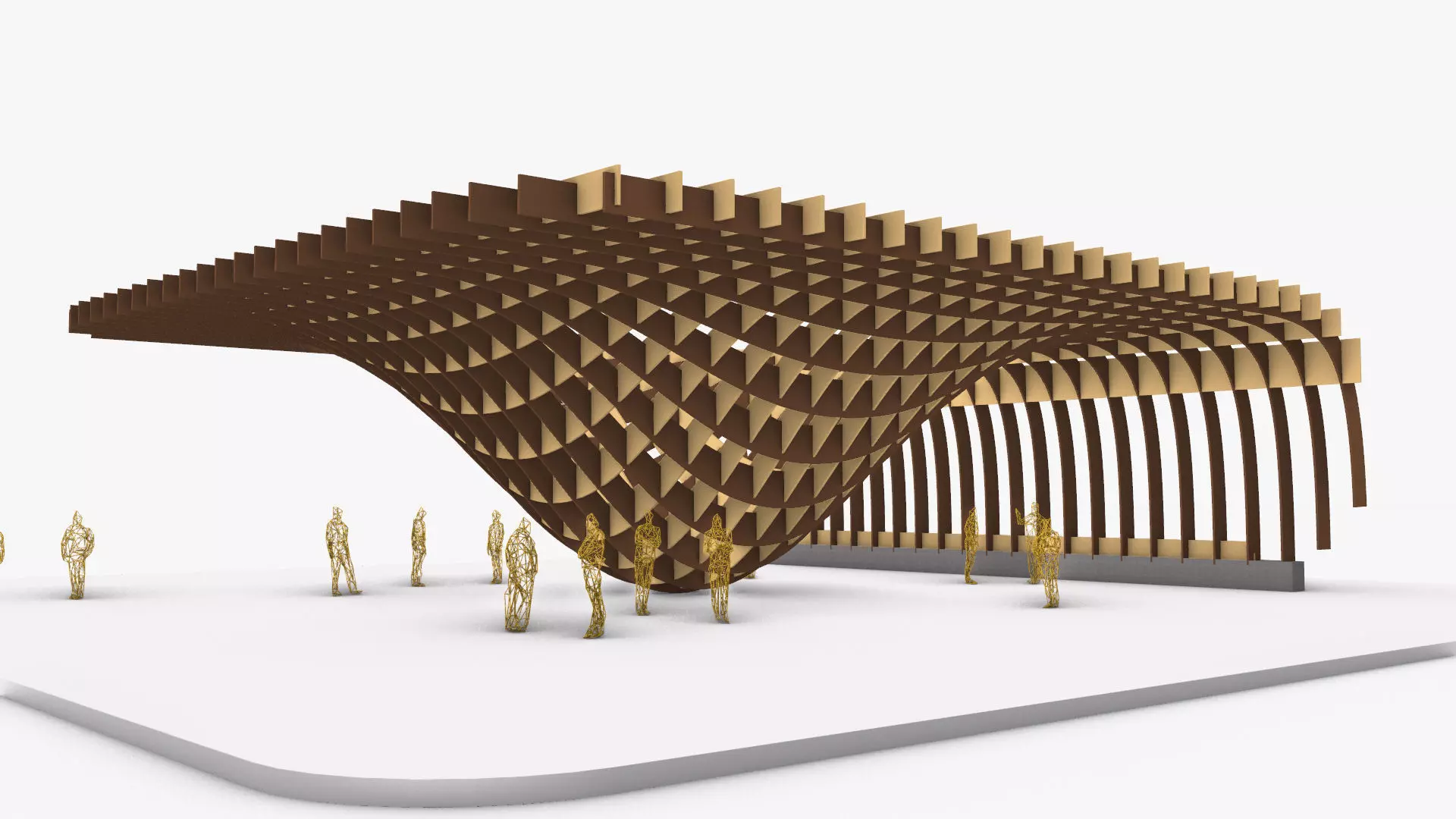 A Wavy Wooden Waffle Structure Pergola with a Parabolic wavy form, with two sets of perpendicular wooden beams, the wooden beams are interlocked with each other with slits and grooves in each beam section, the beams network form a wavy smooth surface with a central mass touched the ground in the middle and the whole structure is rested on one wide side resting on a set of wooden beams locked to a linear concrete base foundation, the model was created using computational parametric tools to achieve the most accurate geometry with clean details, it could be used for architectural render purposes outdoors, and also for Landscaping and urban landmarks.