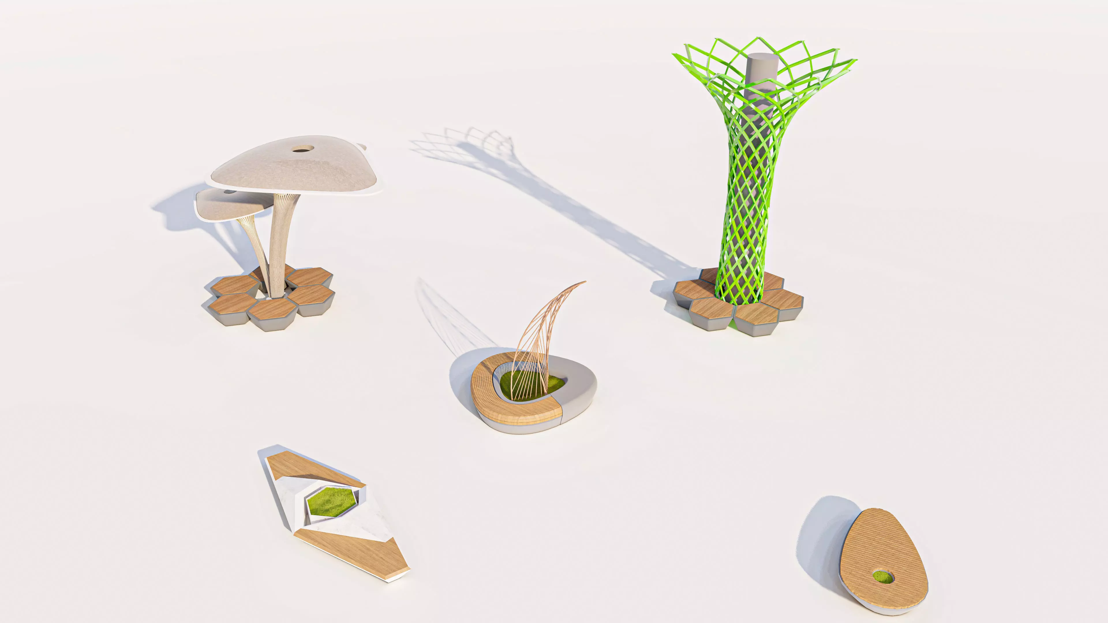 Mushroom-Style Shaders: Features large, organic, umbrella-shaped shade structures supported by single, curved columns. These pieces provide visual interest and functional cover, often featuring a smooth, polished finish (like FRP or white concrete).