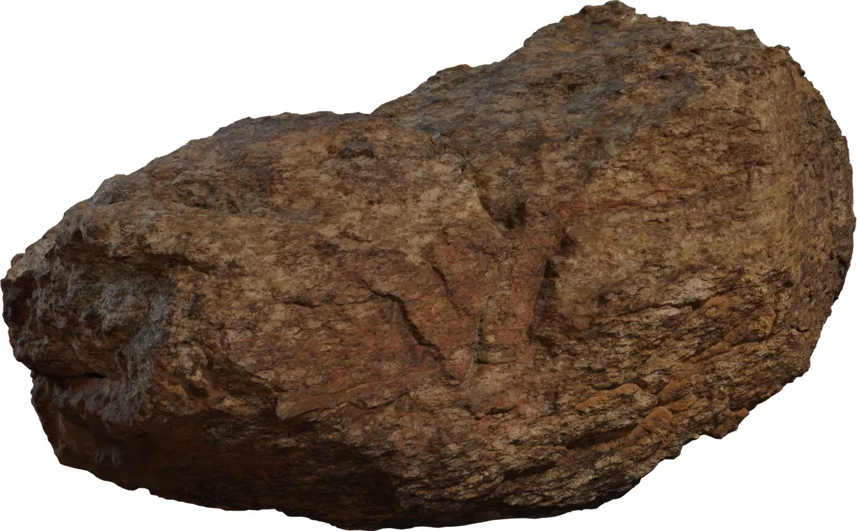 This asset is a high‑detail 3D scan of a large granite boulder with a natural oval silhouette and richly eroded surface, ideal for close‑up hero shots and landscape dressing. The rock features layered cracks, small ledges, and a distinctive carved groove pattern on one side, which catches light and adds visual interest in games and cinematics. Warm brown and reddish tones with darker weathered patches are captured in high‑resolution PBR textures, including basecolor, roughness, normal, and AO maps for realistic shading in modern render engines. Clean triangulated topology preserves micro‑detail while remaining efficient enough for real‑time use, and the mesh can be rotated and partially buried to create varied placements. UVs are fully unwrapped with consistent texel density, allowing quick material tweaks or blending with other terrain shaders in major DCC tools and engines. This granite boulder is well suited for mountain paths, riverbanks, park scenes, and any environment that needs believable rocky elements.