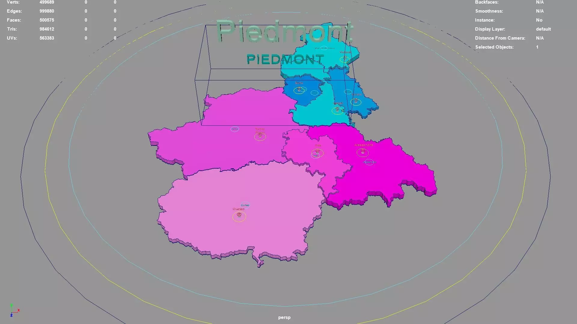 Piedmont regions : The model is divided according to the administrative region of Piedmont. Each region is clearly separated so you can easily isolate it or change the colors. Names are also editable and separate.