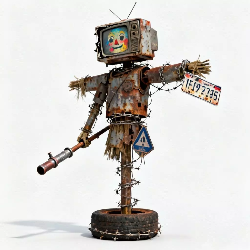 The Overall Concept This asset is a creative survivor style scarecrow built entirely from wasteland debris. It is designed to guard a scavenger camp or a radiated cornfield in a post-apocalyptic or dystopian survival game.