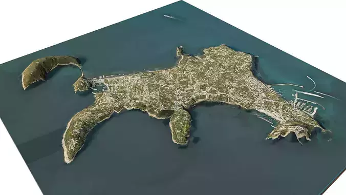 Procida island 3d model terrain. 3d model island of Procida with its landscape of mountains, beaches and forests.