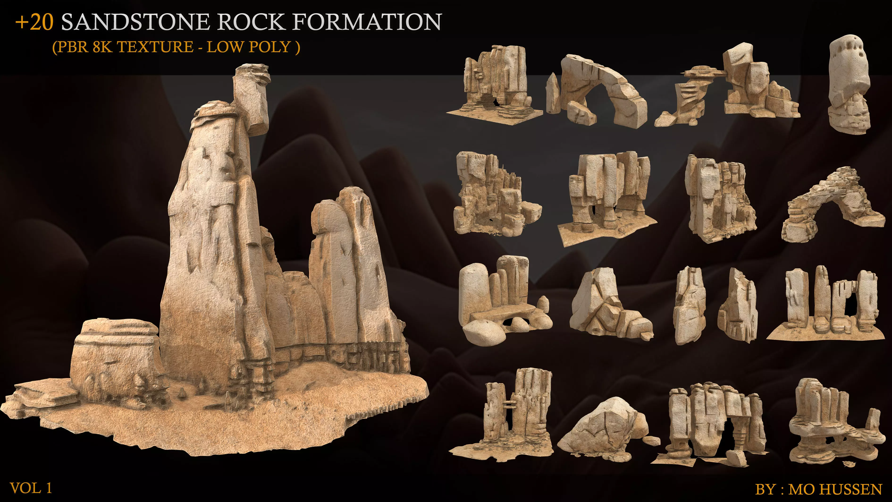 This high-quality 3D model depicts a stylized sandstone rock formation, featuring layered, chiseled surfaces with natural erosion patterns. Ideal for use in game environments, desert or canyon scenes, fantasy landscapes, or architectural visualizations. The model showcases a weathered look with intricate geometric cuts, giving it a hand-crafted or ancient carved monument appearance.