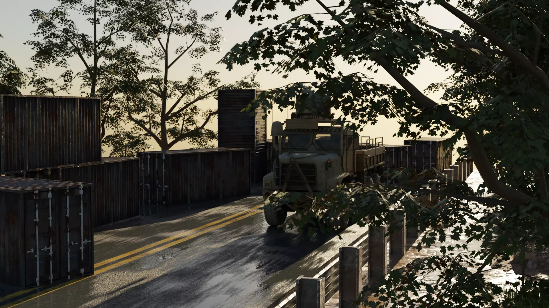 This 3D model depicts a detailed post-apocalyptic or militarized checkpoint scene, rendered with high realism. The central focus is a large military-style truck situated on a wet, reflective asphalt road. The road, marked with dual yellow lines, runs through a barricaded checkpoint made of numerous stacked and rusted shipping containers. These containers form walls and towers, suggesting a fortified zone or a restricted access point.
