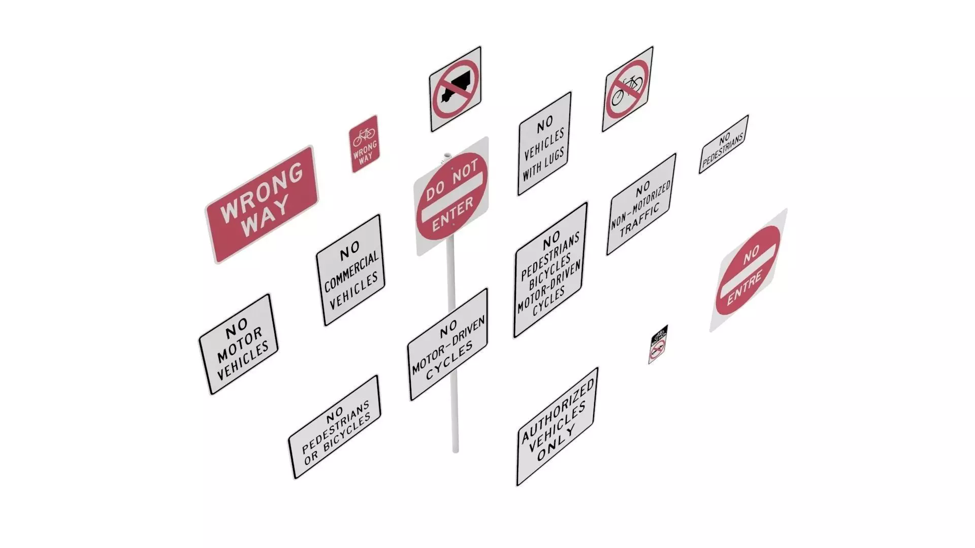 Features:2 Pole Types with Adjustable Height and Sign Brackets,Sign - MUTCD_R5-1 - Do Not Enter,Sign - MUTCD_R5-1a - Wrong Way,Sign - MUTCD_R5-1b - Bicycle Wrong Way,Sign - MUTCD_R5-2 - No Large Trucks,Sign - MUTCD_R5-3 - No motorized Vehicles,Sign - MUTCD_R5-4 - No Cammercial Vehicles,Sign - MUTCD_R5-5 - No Lugged Vehicles,Sign - MUTCD_R5-6 - No Bicycles,Sign - MUTCD_R5-7 - No Nonmotorized Traffic,Sign - MUTCD_R5-8 - No Motorcycles,Sign - MUTCD_R5-10a - No Pedestrian Crossing, Bicycles, or Motorcycles,Sign - MUTCD_R5-10b - No Pedestrian Or Bicycle,Sign - MUTCD_R5-10c - No Pedestrians,Sign - MUTCD_R5-11 - No Unauthorized Vehicles,Sign - NYCDOT_SR-1801 - Bike Path, No Automobiles, New York City,Sign - Puerto_Rico_R5-1 - No Entre, Puerto Rico.