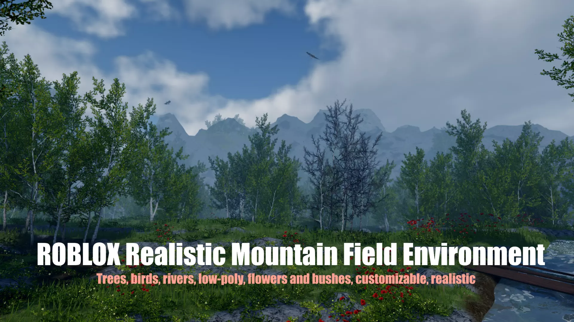 This is a medium-sized field scene consisting of mountainous birch trees scattered across large fields flowering with bushes, flowers and rocks - with a river flowing at the edge. All assets shown in pictures are included. All assets use PBR-materials. The scene is realistic, while performance friendly (avg. 100 fps (NVIDIA RTX 3060Ti), Intel iCore i7-11700F 2.50Ghz), rendered at 2560x1440p, max roblox settings).