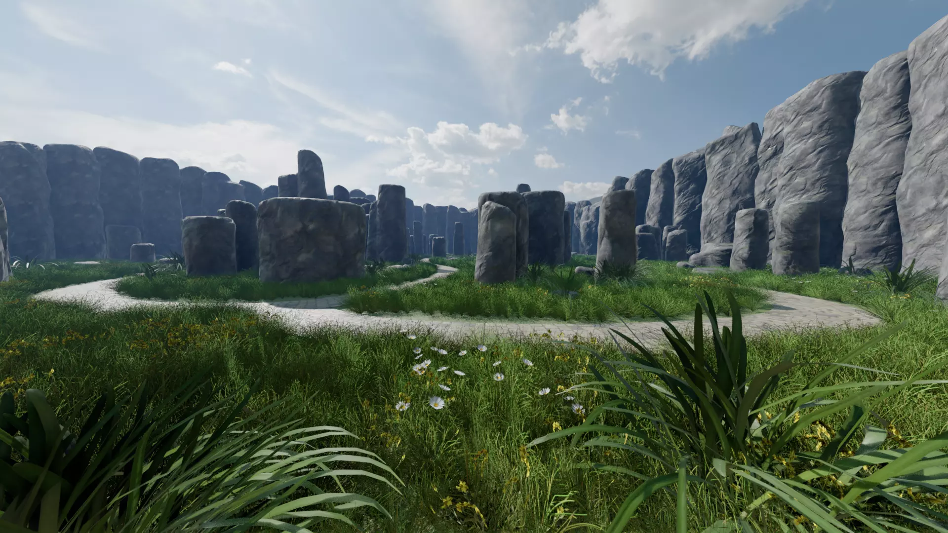 The scene is populated with stone path, rock pillars, grass, wildflowers - details like winding pathways, circular layout, tall monolithic stones add authenticity and depth. Well-suited for outdoor game environments, landscape visualization, and AI training datasets covering natural terrain and wilderness scenes.