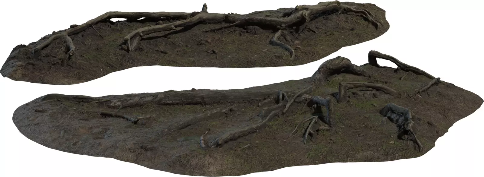 This asset set contains two large rooted forest ground patches that combine soil, exposed tree roots, and scattered organic debris into ready‑to‑use environment modules. Each piece features intricate root networks that rise above and dive back into the earth, creating natural arches, steps, and channels that work well for paths, slopes, and focal foreground areas. High‑resolution PBR textures capture damp soil, fine needles, mossy hints, and worn bark, delivering convincing detail for close‑up camera work in games and cinematics. The meshes use clean triangulated topology to preserve complex silhouettes while remaining efficient when tiled or repeated in real‑time engines such as Unreal or Unity. UVs are fully unwrapped with consistent texel density, supporting lightmapping and material blending workflows in major DCC tools. These rooted patches are ideal for forest trails, ancient grove clearings, and fantasy woods that need believable ground detail with minimal setup.
