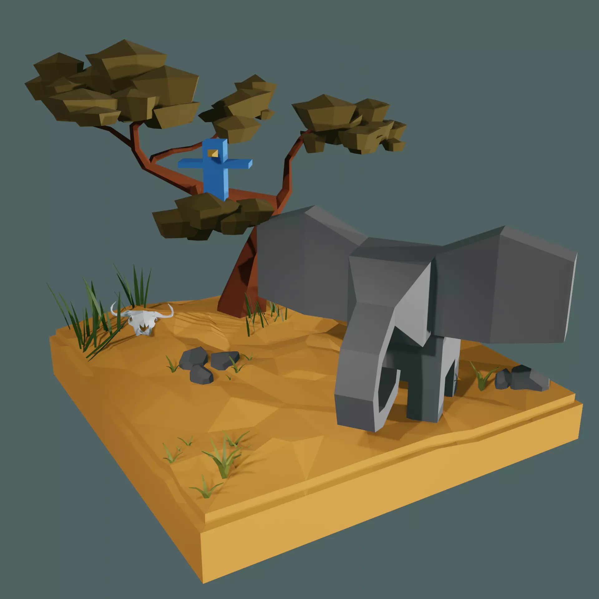 This is a unique and artistic 3D model of a stylized savannah scene created in Blender. The scene features a stylized elephant, a whimsical tree with exaggerated proportions, and a stylized bird perched on a branch. This model is perfect for adding a touch of fantasy and whimsy to your projects.