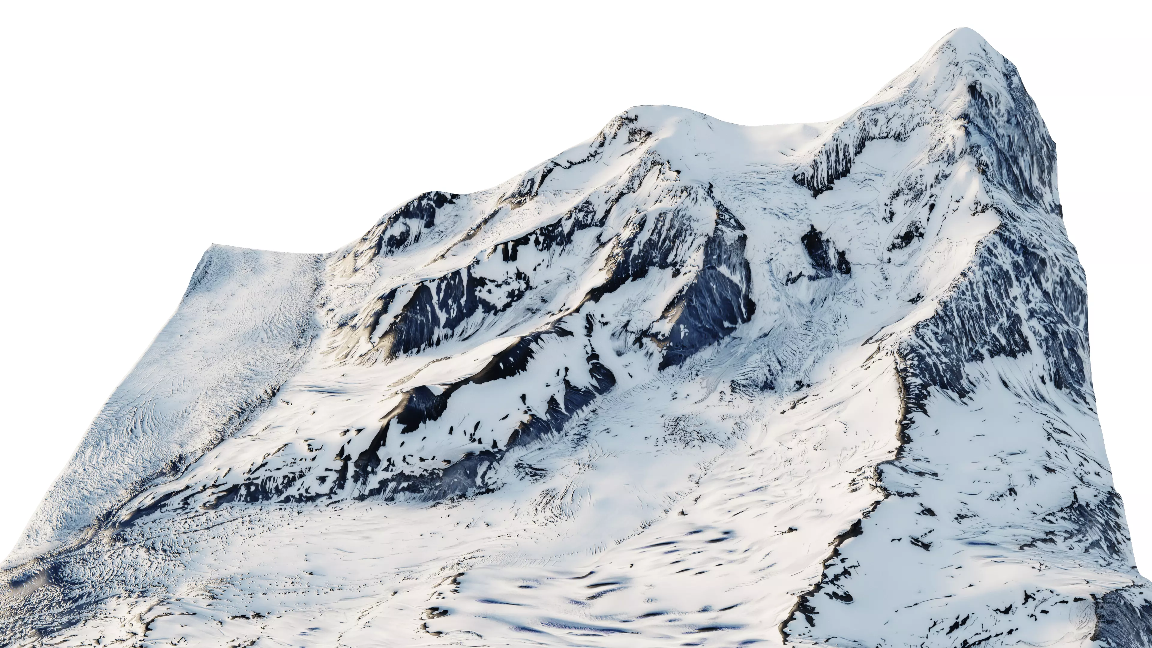 beautiful snowy mountain peaks with slopes extending all the way to frozen rivers 3d terrain modelsbased on Mount Saint Elias in alaska