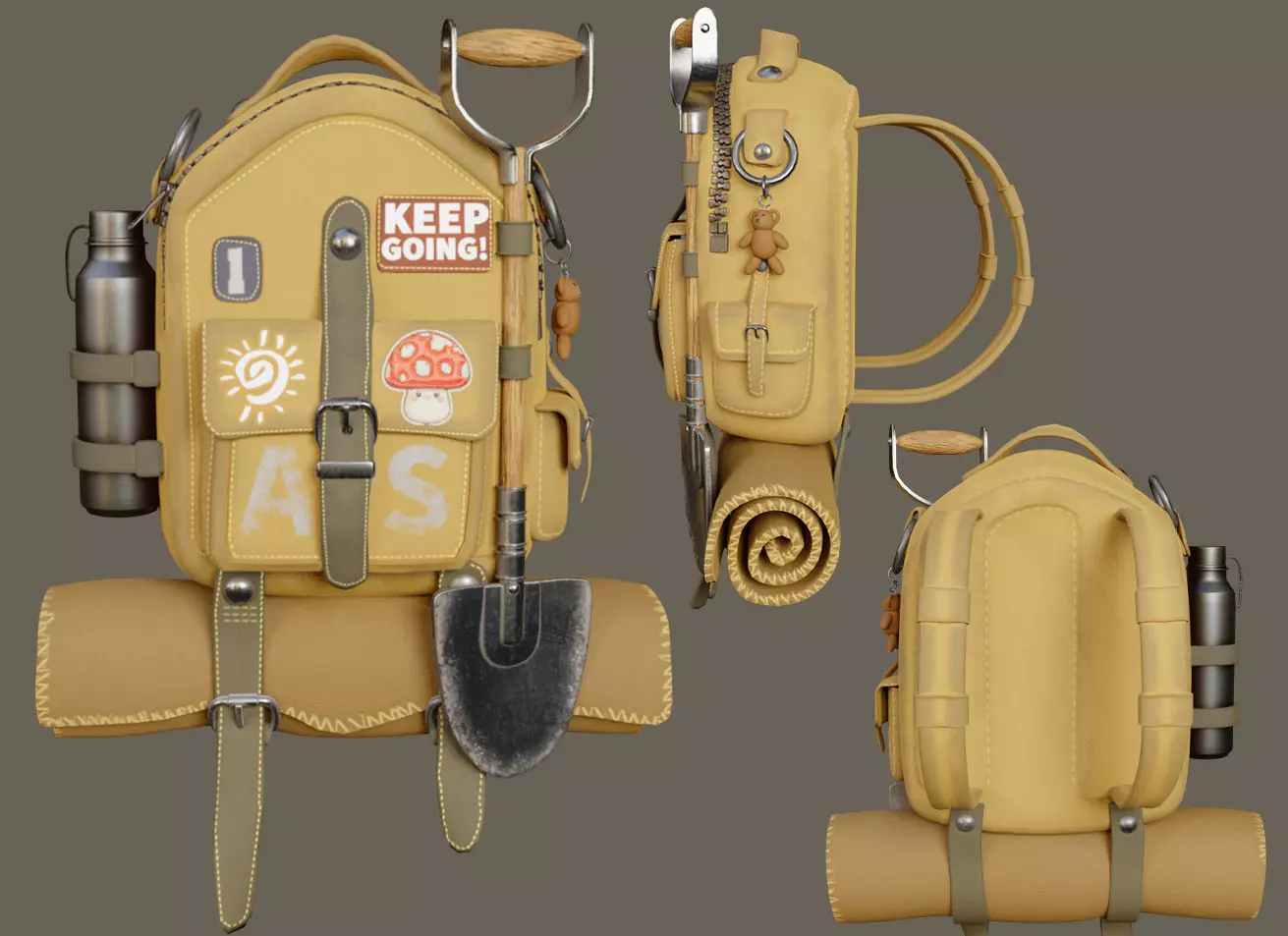 This is a high-quality stylized backpack asset, inspired by adventure, travel, and survival themes.Perfect for games, animation, and VR/AR experiences.The model comes with detailed accessories including a bottle, shovel, blanket, and motivational badges.The asset was modeled in Autodesk Maya and textured in Substance Painter to ensure a clean, optimized topology and realistic PBR materials. Rendered in Marmoset Toolbag for preview images.